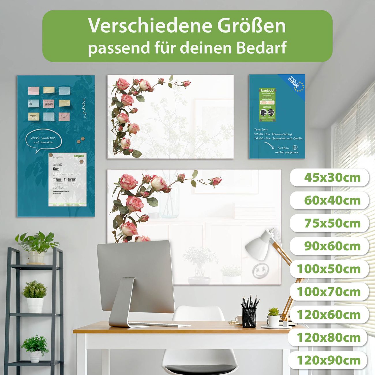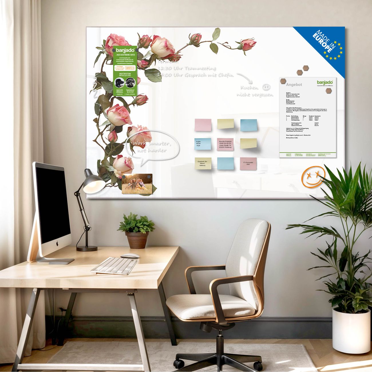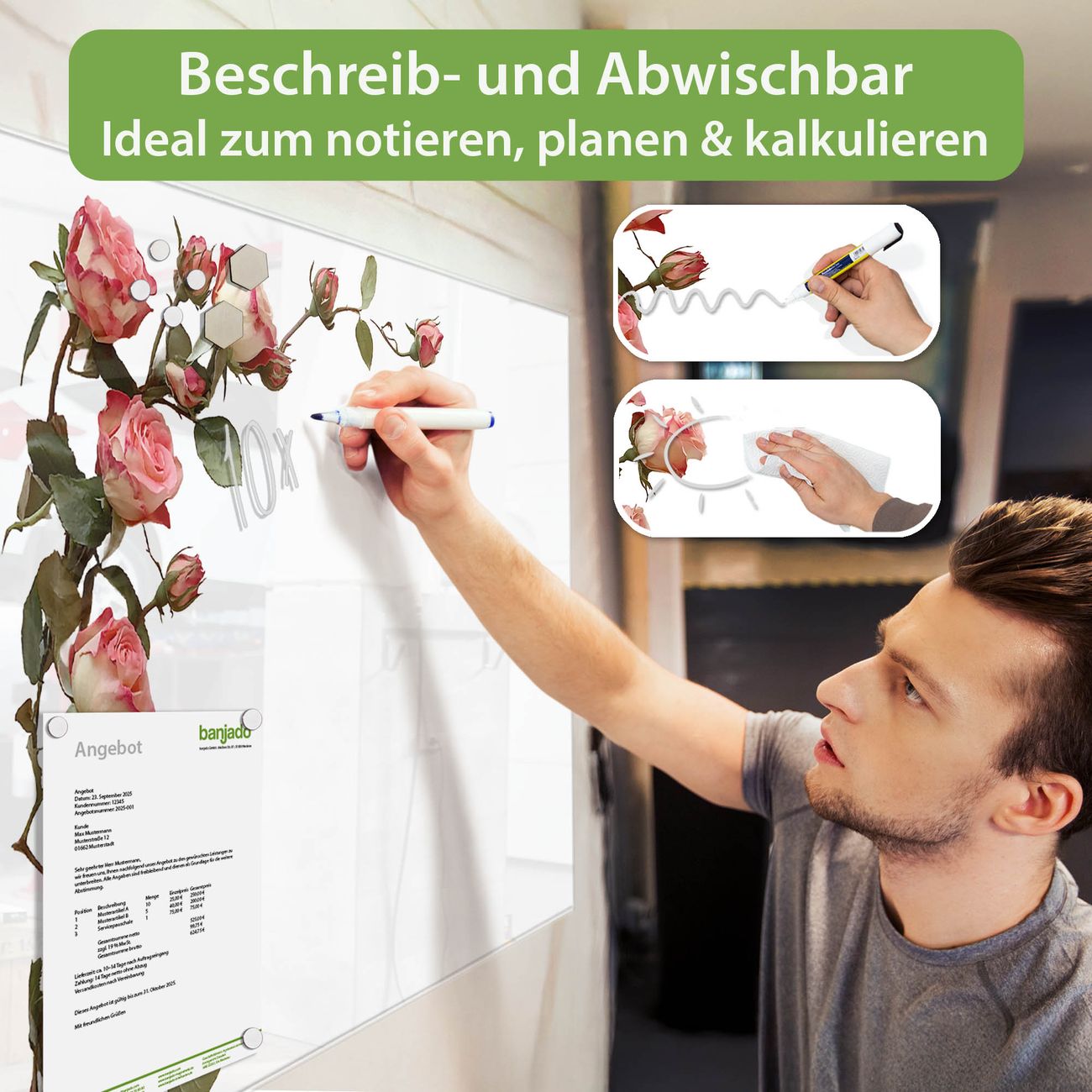 Jede Glas Magnettafel wird in unserer Werkstatt von Hand gefertigt und sorgfältig geprüft. So erhalten Sie ein echtes Qualitätsprodukt, das Funktion und Ästhetik perfekt vereint.?? Warum banjado?