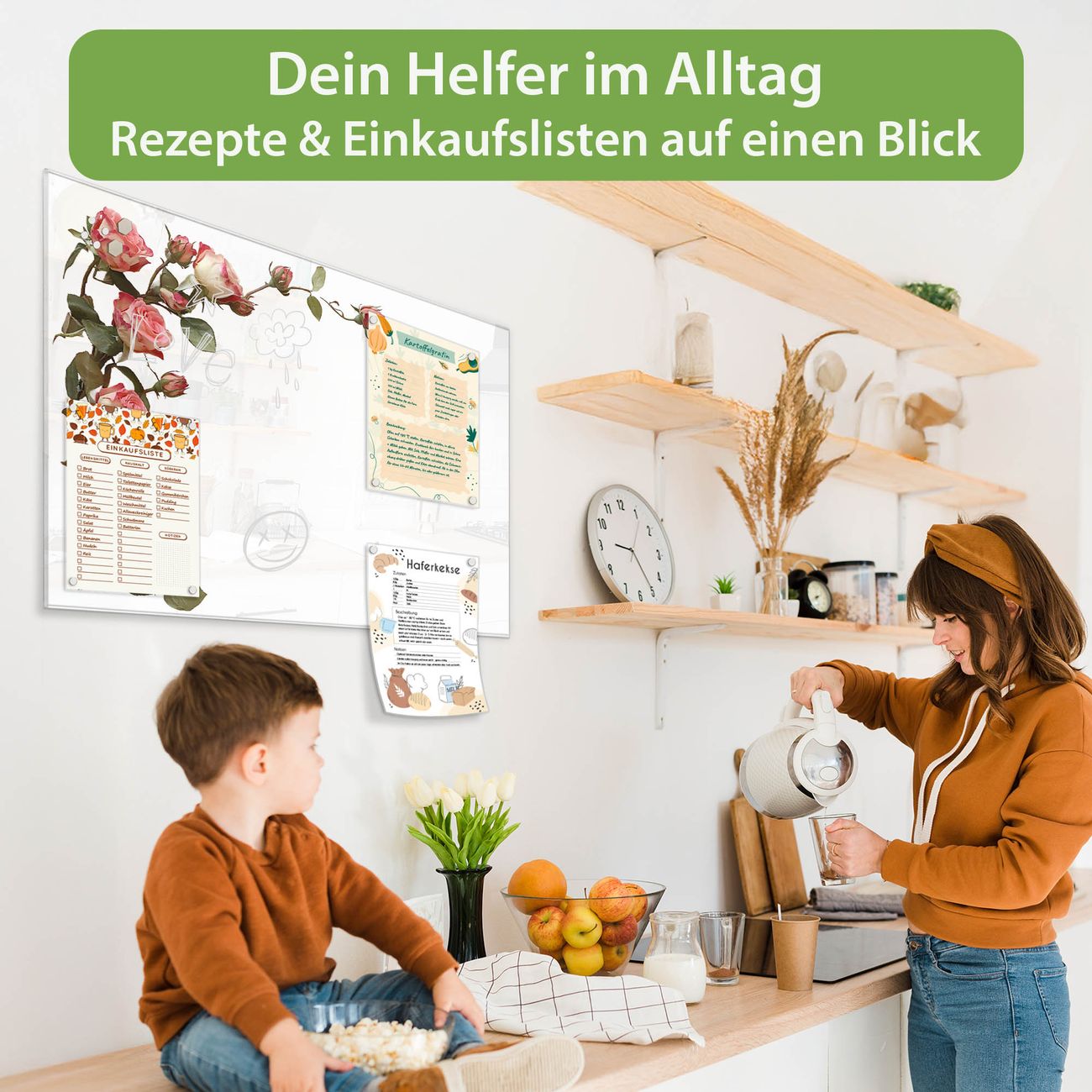 Auf der glatten Glasoberfläche lassen sich Termine, Rezepte oder Notizen ganz einfach mit Kreidestiften festhalten und rückstandslos entfernen. Starke Neodym-Magnete halten Ihre wichtigsten Erinnerungen sicher an Ort und Stelle. So entsteht Ihre ganz persönliche Ideenwand - jeden Tag neu.