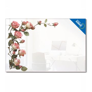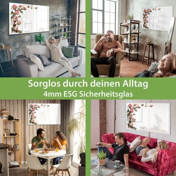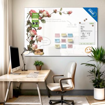Material: 4mm Sicherheitsglas mit Metallrückwand Eigenschaften: beschreibbar, magnetisch, kratzfest Maße: 75x50x0,6cm, 5,63kg schwer Motiv Nummer 13201 Zarte Rosenpracht Zubehör: inklusive 4 Neodym-Magnete