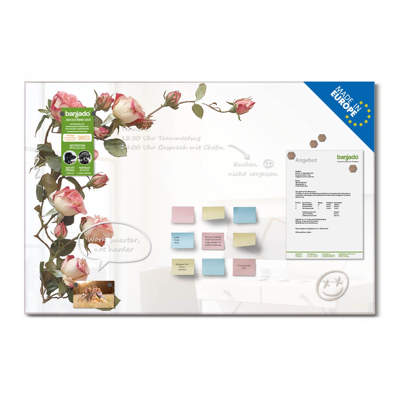 Ein Stück Design, das Ihren Alltag organisiert. Schreiben, heften, inspirieren - alles an einem Ort. Qualität, die man spürt. Montage leicht gemacht. Handwerk mit Herz - veredelt in Sachsen. Einzigartiges Design mit Motiv Motiv Zarte Rosenpracht Beschreibbare Glasoberfläche, leicht zu reinigen Starke Magnetkraft durch Stahlrückwand Inklusive 4 Neodym-Magneten Flexible Montageoptionen Handveredelt in Sachsen - Qualität, die bleibt