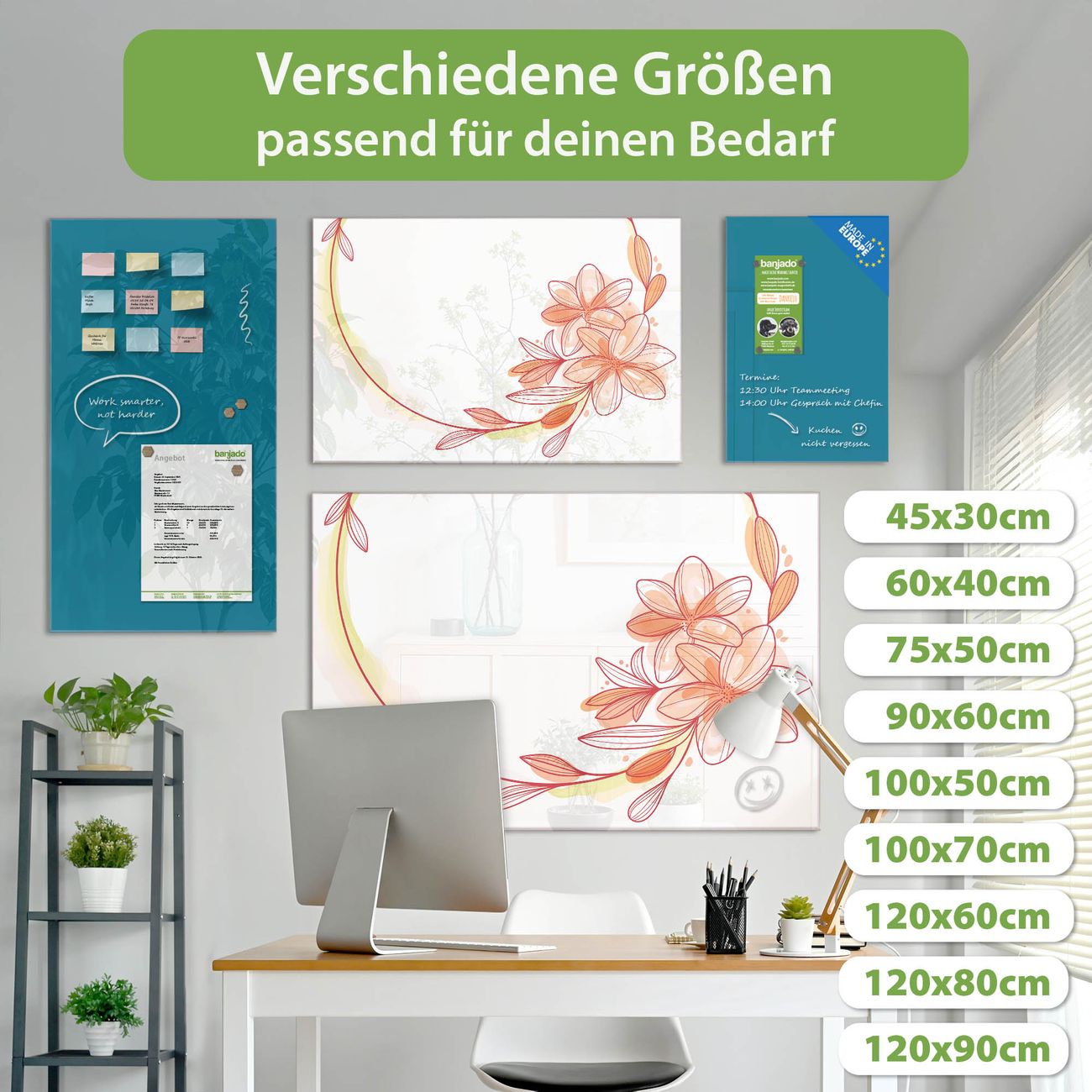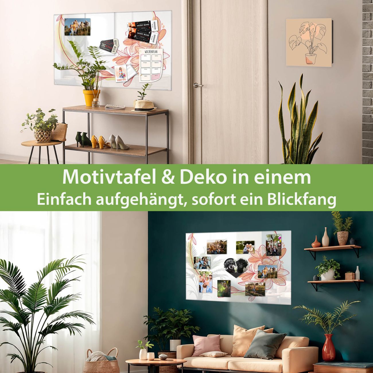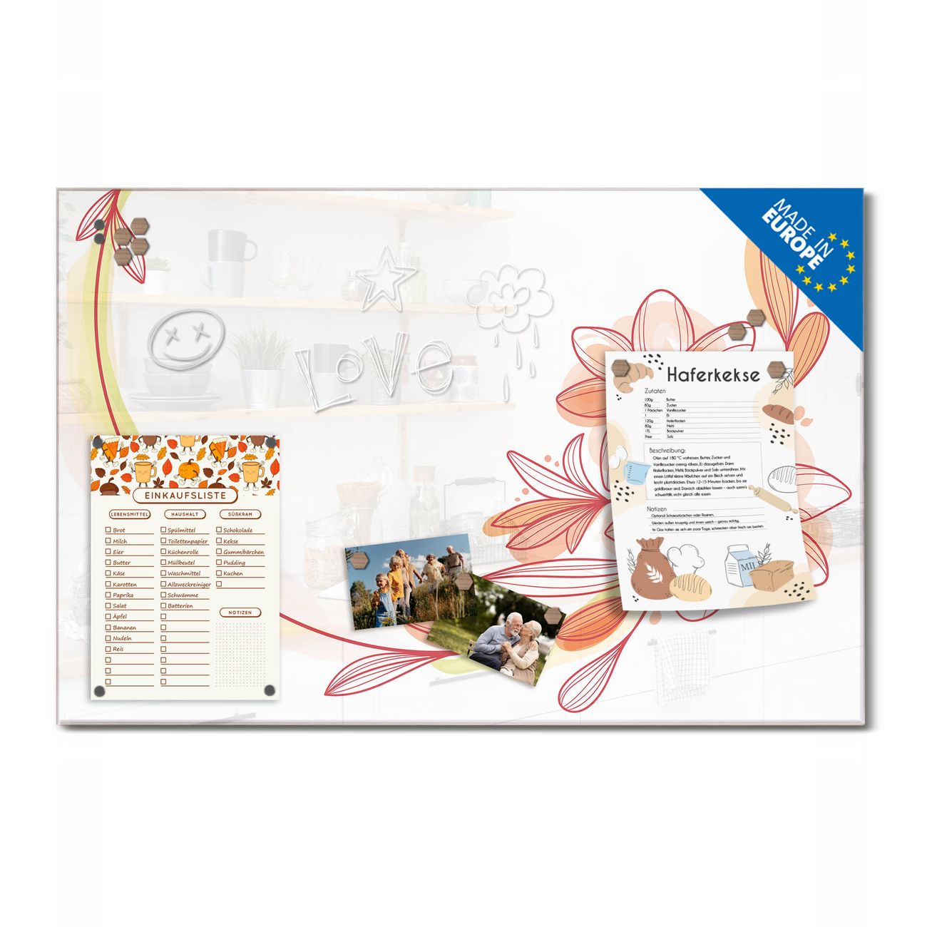 Material: 4mm Sicherheitsglas mit Metallrückwand Eigenschaften: beschreibbar, magnetisch, kratzfest Maße: 75x50x0,6cm, 5,63kg schwer Motiv Nummer 13522 Zarter Blütenkranz Zubehör: inklusive 4 Neodym-Magnete