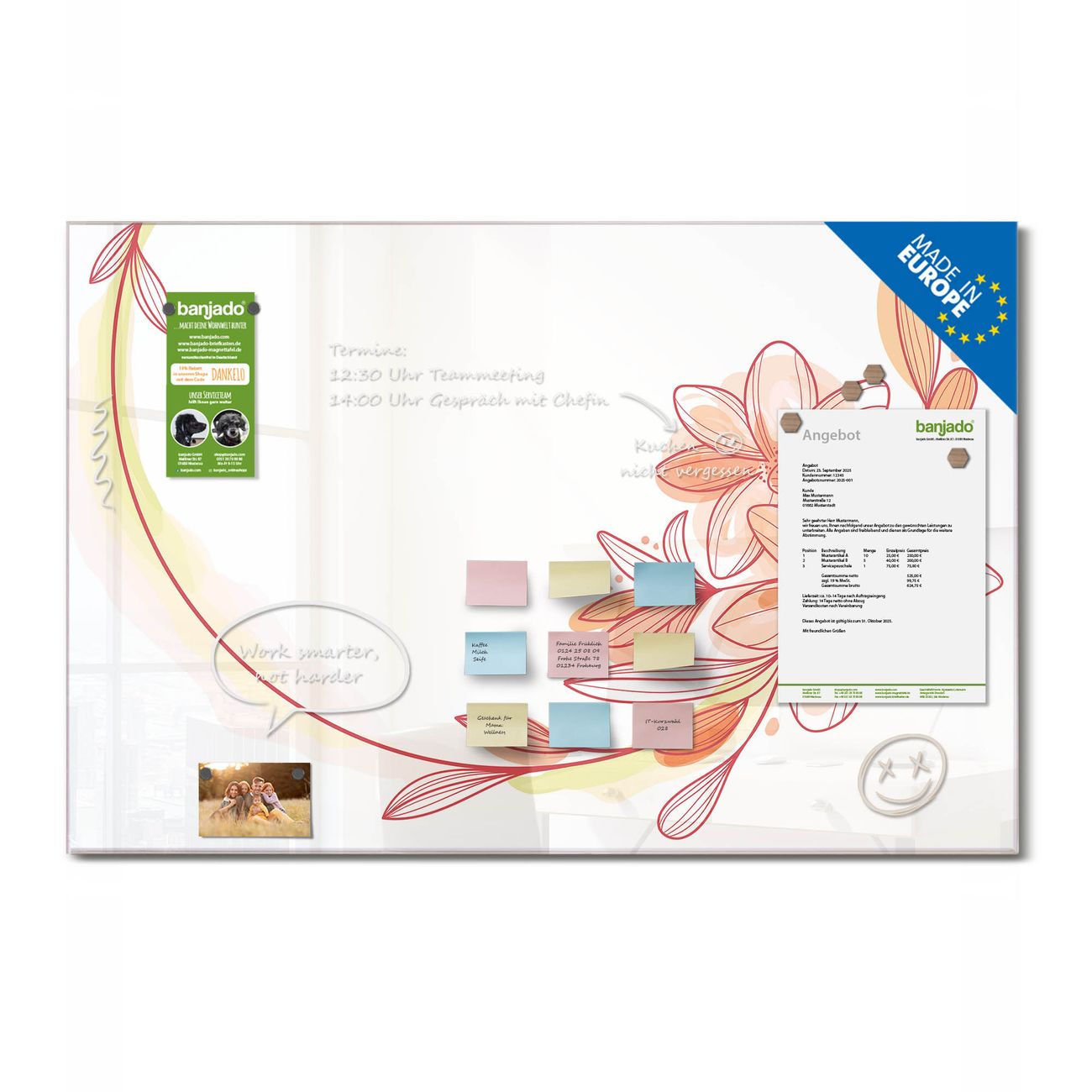 Material: 4mm Sicherheitsglas mit Metallrückwand Eigenschaften: beschreibbar, magnetisch, kratzfest Maße: 120x80x0,6cm, 14,40kg schwer Motiv Nummer 13522 Zarter Blütenkranz Zubehör: inklusive 4 Neodym-Magnete