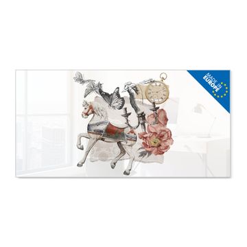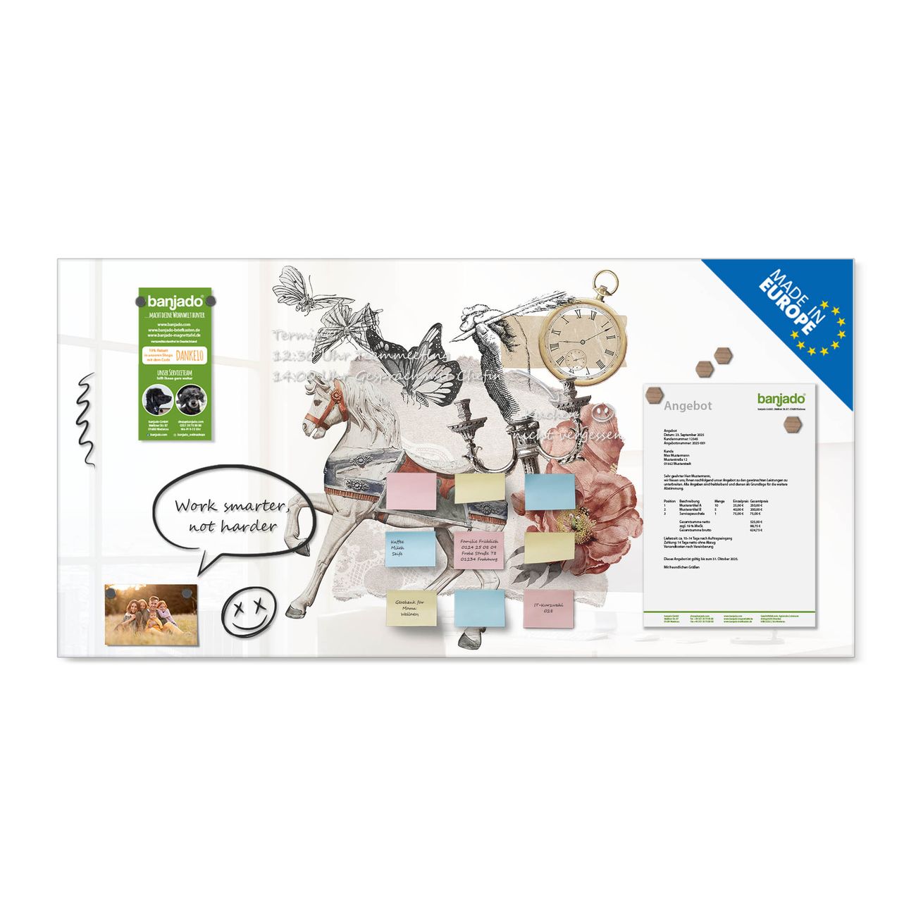 Material: 4mm Sicherheitsglas mit Metallrückwand Eigenschaften: beschreibbar, magnetisch, kratzfest Maße: 100x50x0,6cm, 7,50kg schwer Motiv Nummer 13383 Zeitreise-Kollage Zubehör: inklusive 4 Neodym-Magnete