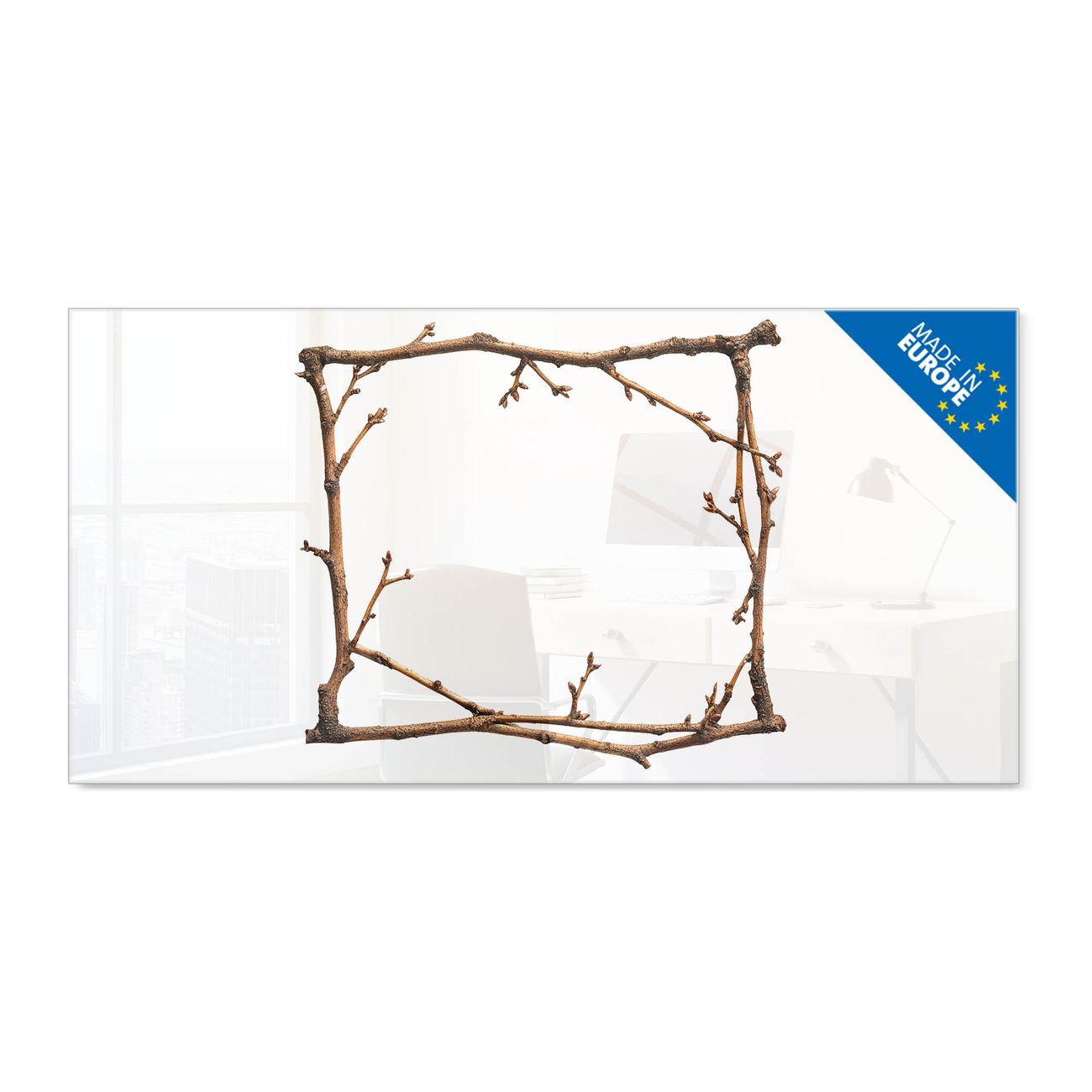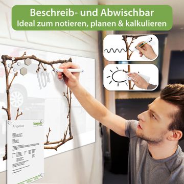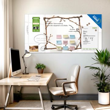 Material: 4mm Sicherheitsglas mit Metallrückwand Eigenschaften: beschreibbar, magnetisch, kratzfest Maße: 100x50x0,6cm, 7,50kg schwer Motiv Nummer 13552 Zweigrahmen Zubehör: inklusive 4 Neodym-Magnete