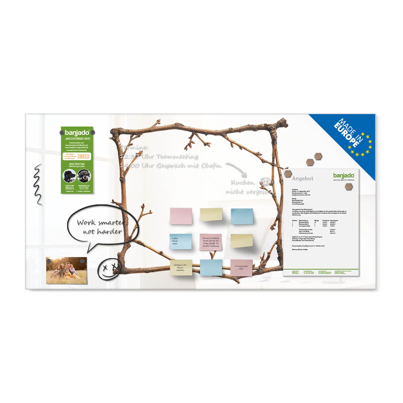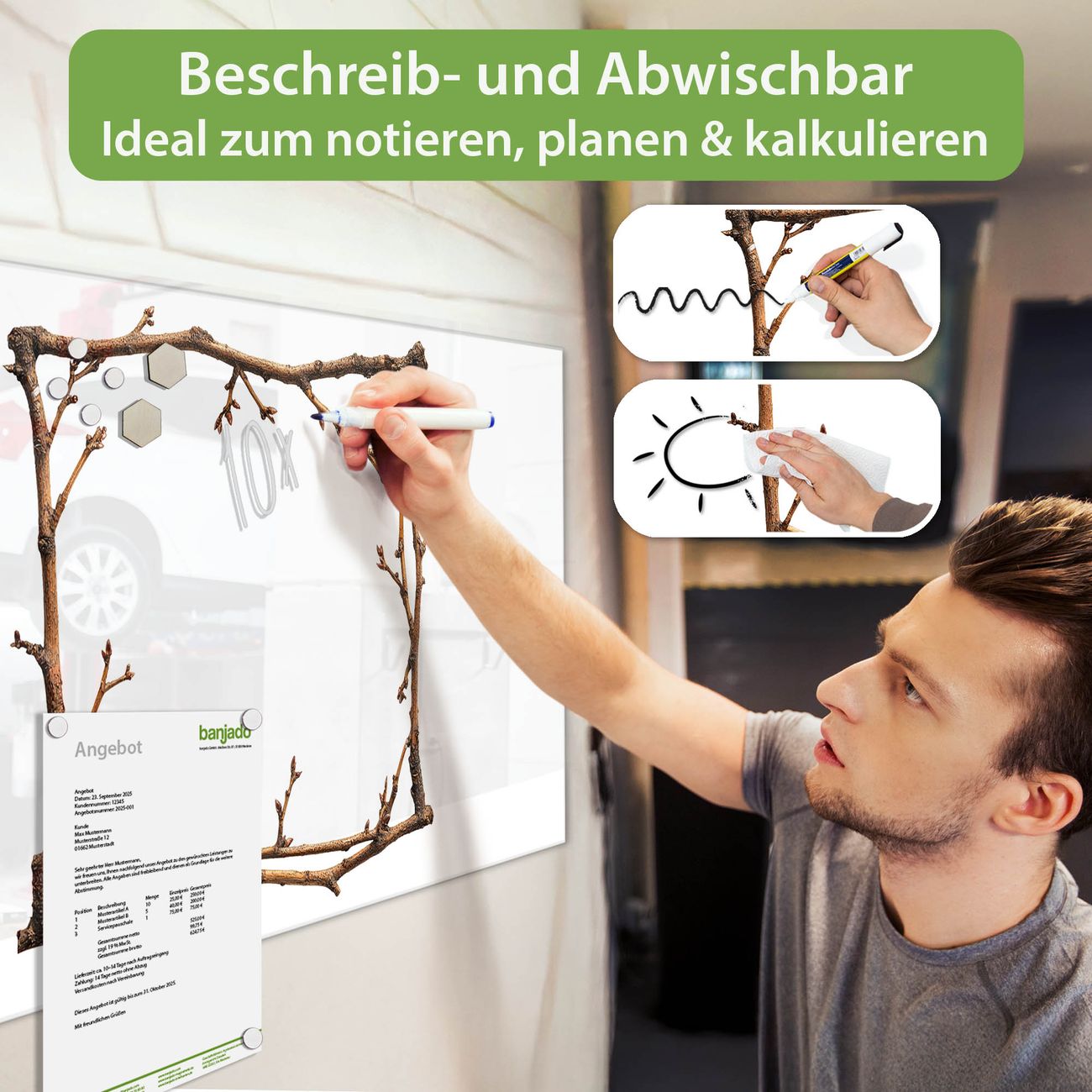 Jede Glas Magnettafel wird in unserer Werkstatt von Hand gefertigt und sorgfältig geprüft. So erhalten Sie ein echtes Qualitätsprodukt, das Funktion und Ästhetik perfekt vereint.?? Warum banjado?