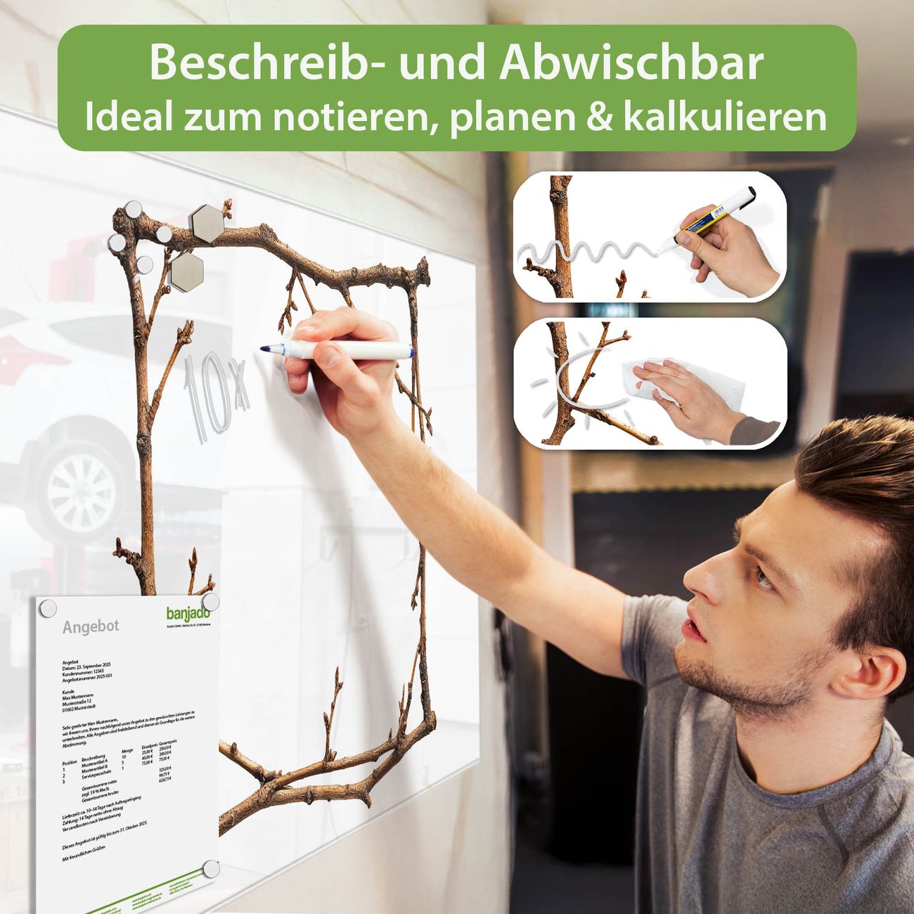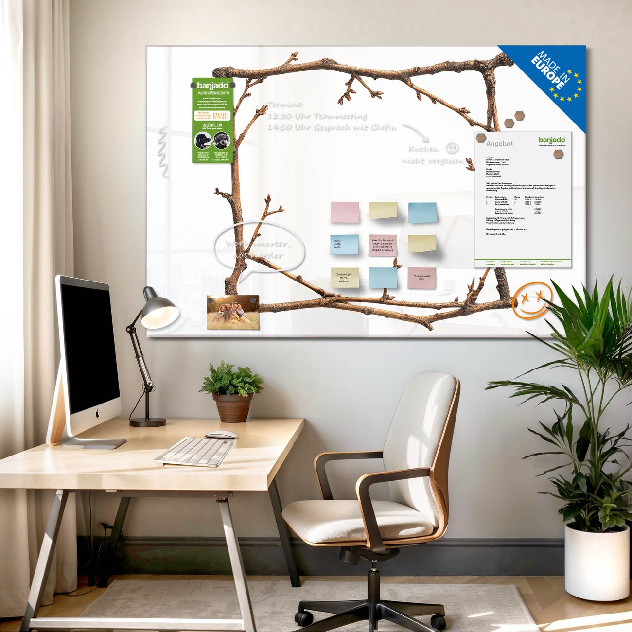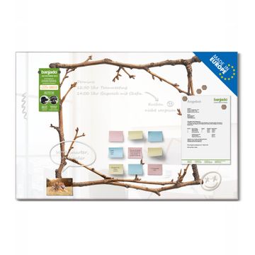 Material: 4mm Sicherheitsglas mit Metallrückwand Eigenschaften: beschreibbar, magnetisch, kratzfest Maße: 120x80x0,6cm, 14,40kg schwer Motiv Nummer 13552 Zweigrahmen Zubehör: inklusive 4 Neodym-Magnete