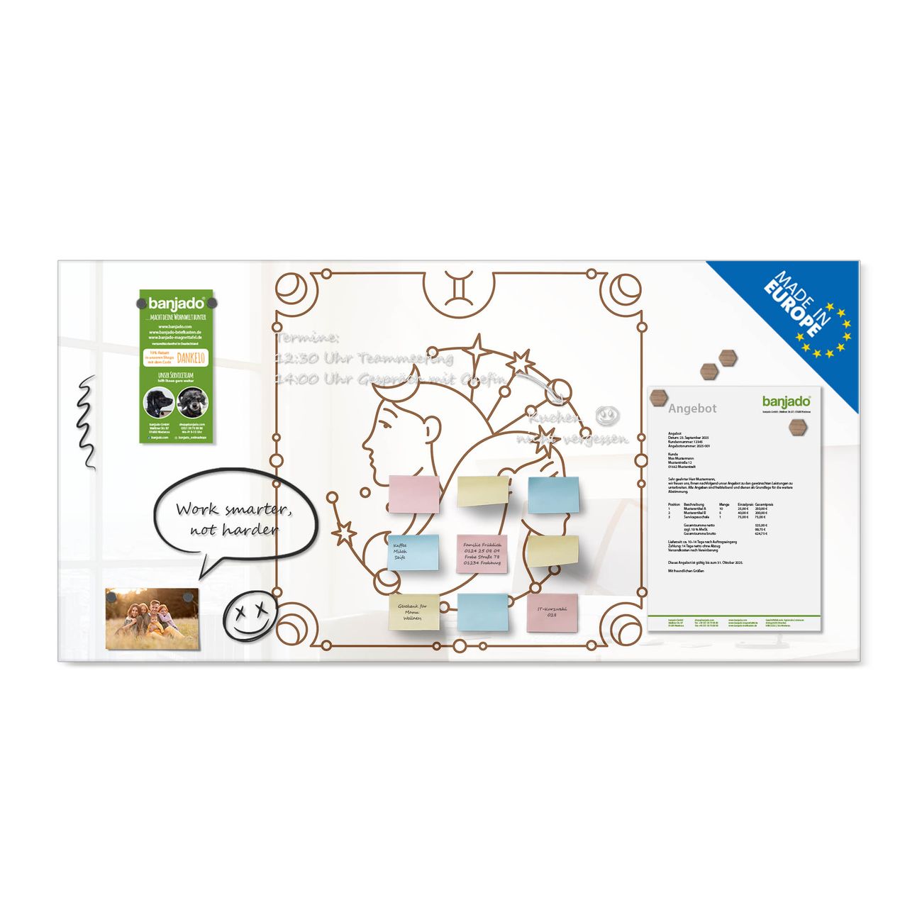 Material: 4mm Sicherheitsglas mit Metallrückwand Eigenschaften: beschreibbar, magnetisch, kratzfest Maße: 100x50x0,6cm, 7,50kg schwer Motiv Nummer 13186 Zwillingskonstellation Zubehör: inklusive 4 Neodym-Magnete