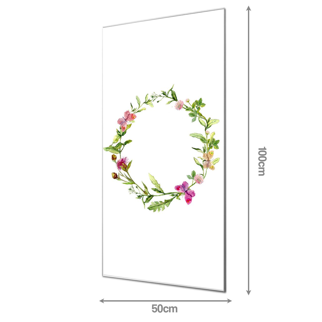 Material: 4mm Sicherheitsglas mit Metallrückwand Eigenschaften: beschreibbar, magnetisch, kratzfest Maße: 50x100x0,6cm, 7,50 kg schwer Motiv Nummer 12975 Aquarell Blumenring Zubehör: inklusive 4 Neodym-Magnete