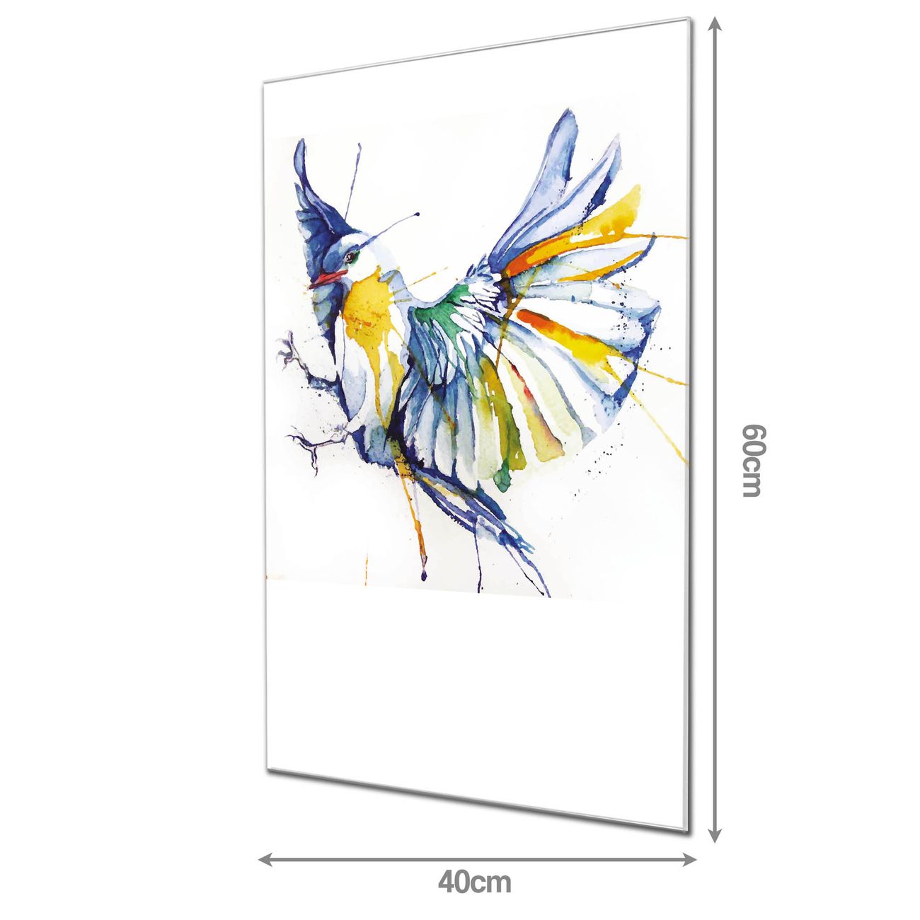 Material: 4mm Sicherheitsglas mit Metallrückwand Eigenschaften: beschreibbar, magnetisch, kratzfest Maße: 40x60x0,6cm, 3,60 kg schwer Motiv Nummer 12944 Aquarell Vogel Zubehör: inklusive 4 Neodym-Magnete