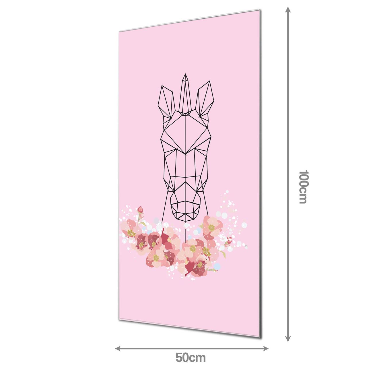 Material: 4mm Sicherheitsglas mit Metallrückwand Eigenschaften: beschreibbar, magnetisch, kratzfest Maße: 50x100x0,6cm, 7,50 kg schwer Motiv Nummer 12947 Einhorn Poygon Zubehör: inklusive 4 Neodym-Magnete