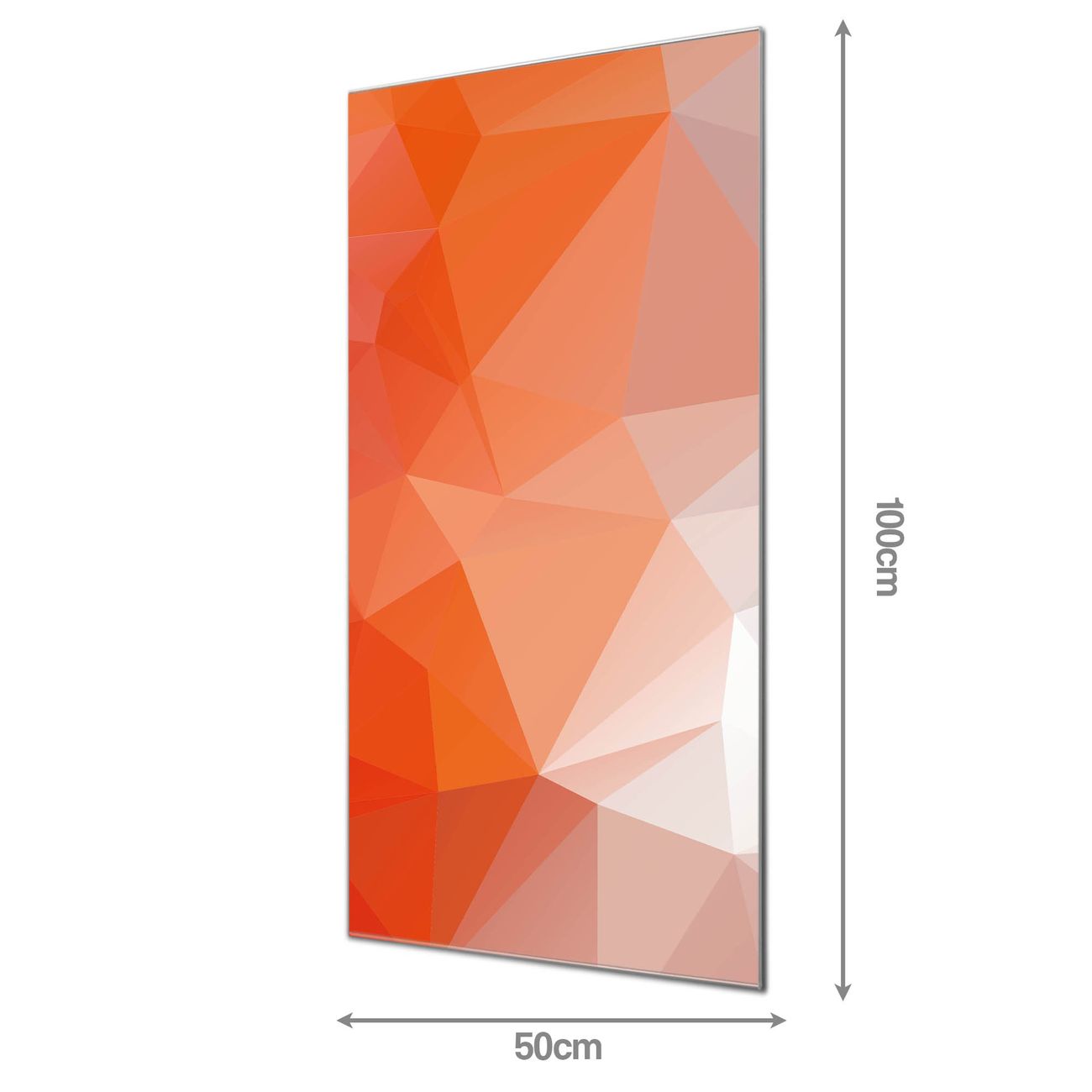 Material: 4mm Sicherheitsglas mit Metallrückwand Eigenschaften: beschreibbar, magnetisch, kratzfest Maße: 50x100x0,6cm, 7,50 kg schwer Motiv Nummer 12952 Orange Polygon Zubehör: inklusive 4 Neodym-Magnete