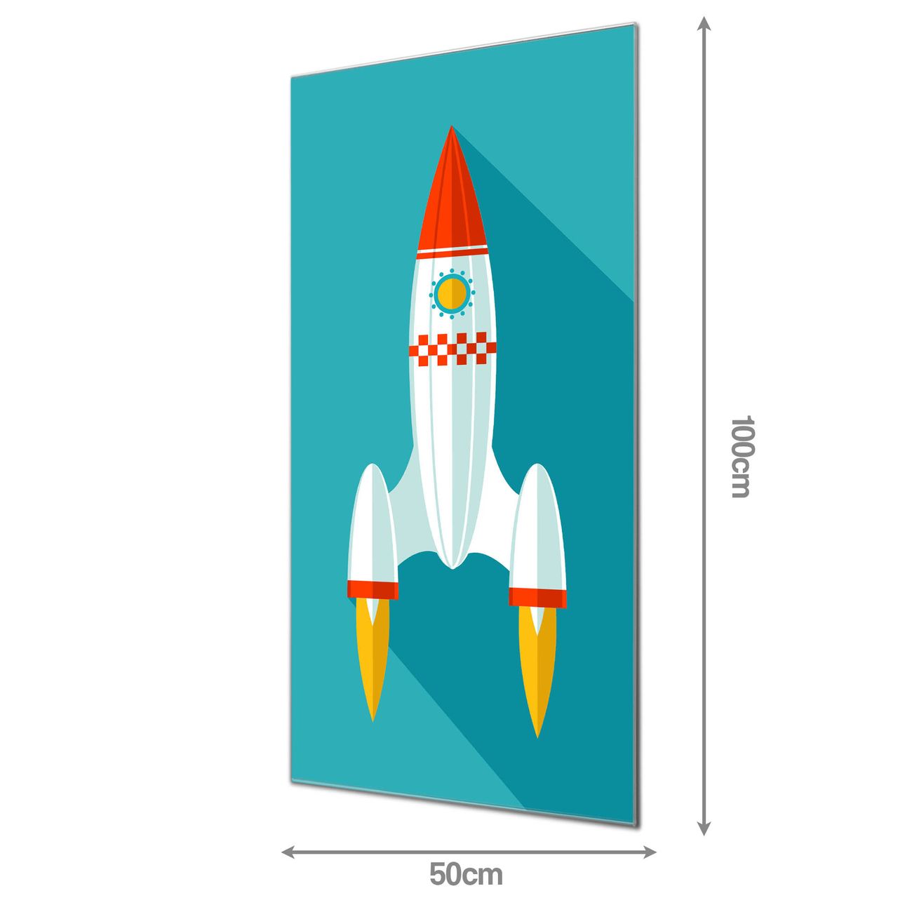 Material: 4mm Sicherheitsglas mit Metallrückwand Eigenschaften: beschreibbar, magnetisch, kratzfest Maße: 50x100x0,6cm, 7,50 kg schwer Motiv Nummer 12962 Rakete Zubehör: inklusive 4 Neodym-Magnete
