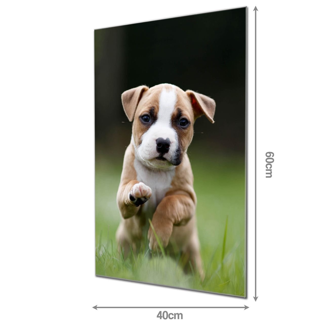Material: 4mm Sicherheitsglas mit Metallrückwand Eigenschaften: beschreibbar, magnetisch, kratzfest Maße: 40x60x0,6cm, 3,60 kg schwer Motiv Nummer 12977 Welpe im Gras Zubehör: inklusive 4 Neodym-Magnete