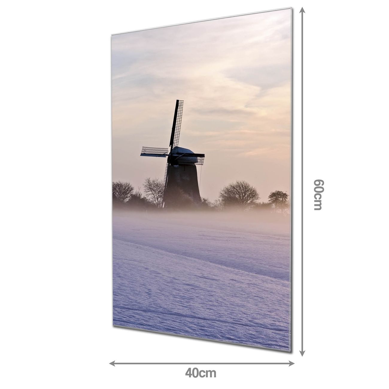 Material: 4mm Sicherheitsglas mit Metallrückwand Eigenschaften: beschreibbar, magnetisch, kratzfest Maße: 40x60x0,6cm, 3,60 kg schwer Motiv Nummer 12988 Windmühle im Winter Zubehör: inklusive 4 Neodym-Magnete