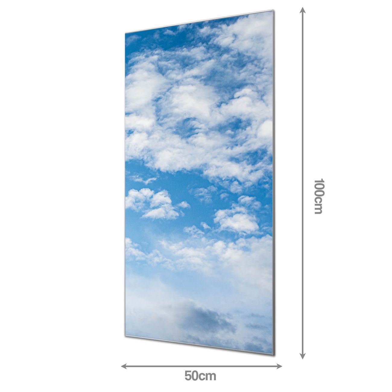 Material: 4mm Sicherheitsglas mit Metallrückwand Eigenschaften: beschreibbar, magnetisch, kratzfest Maße: 50x100x0,6cm, 7,50 kg schwer Motiv Nummer 12830 Wolken 1 Zubehör: inklusive 4 Neodym-Magnete