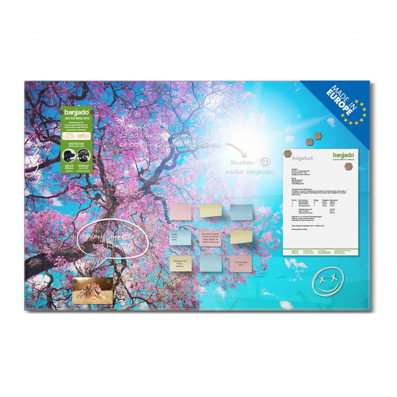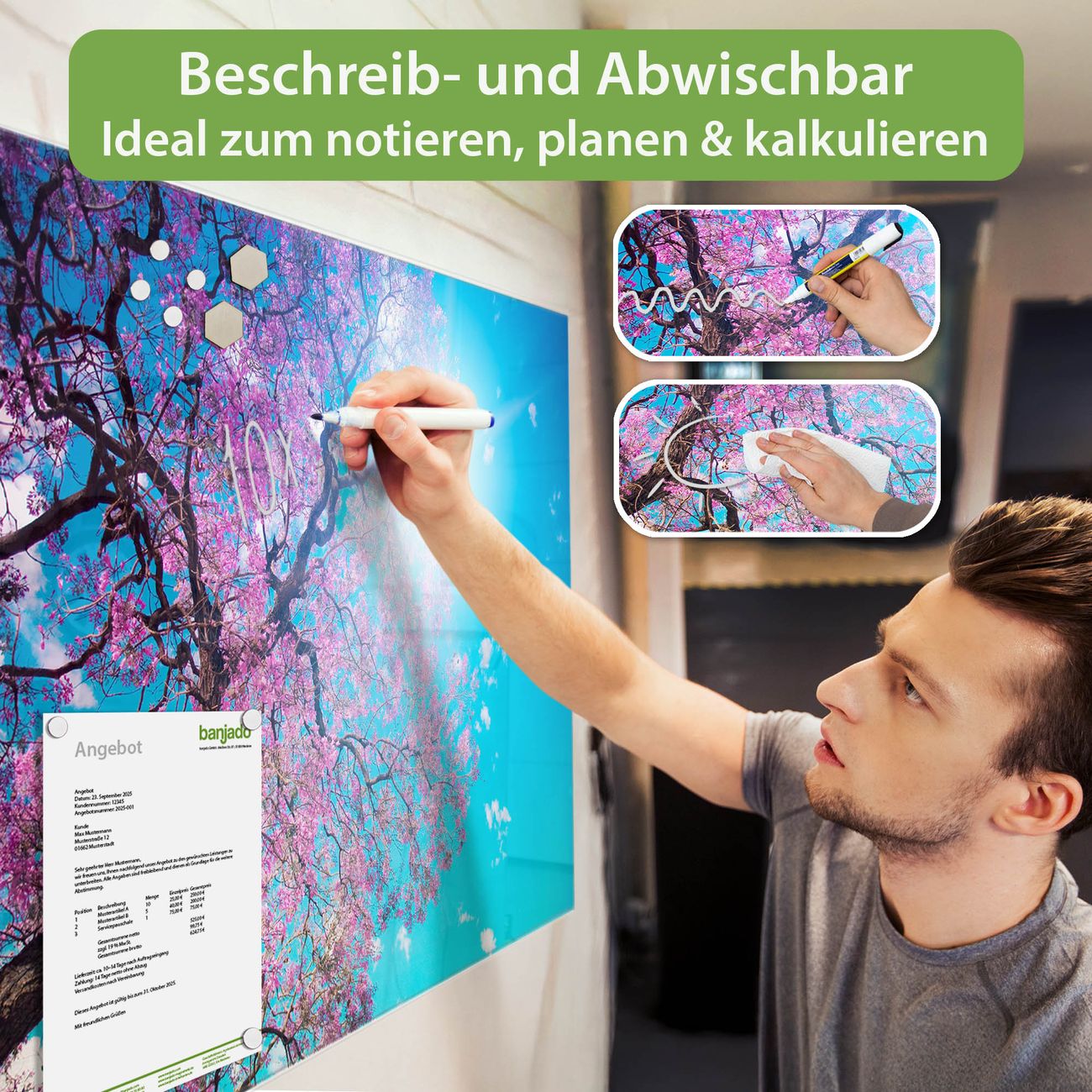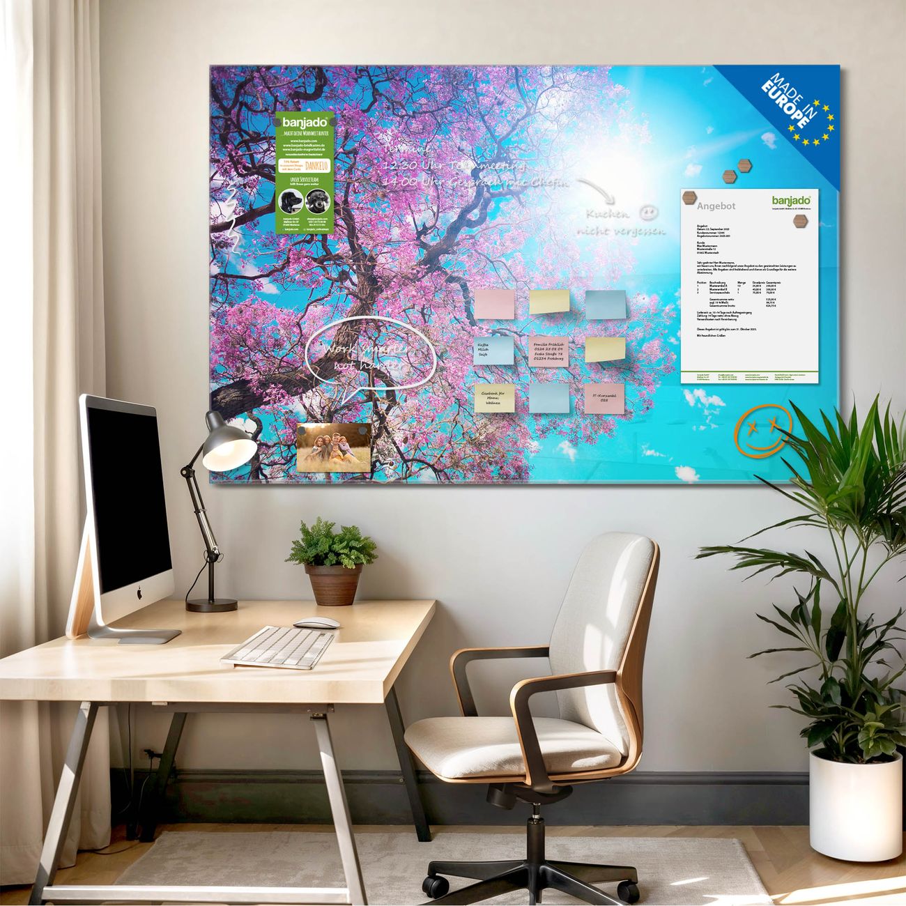 Jede Glas Magnettafel wird in unserer Werkstatt von Hand gefertigt und sorgfältig geprüft. So erhalten Sie ein echtes Qualitätsprodukt, das Funktion und Ästhetik perfekt vereint.?? Warum banjado?