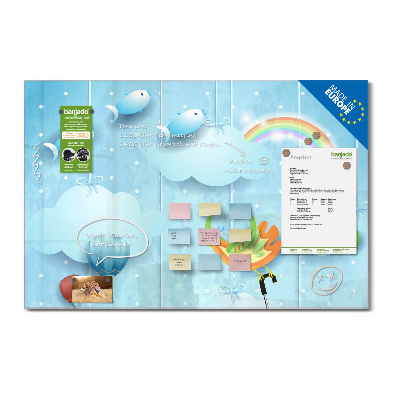 Material: 4mm Sicherheitsglas mit Metallrückwand Eigenschaften: beschreibbar, magnetisch, kratzfest Maße: 90x60x0,6cm, 8,10kg schwer Motiv Nummer 12858 fliegender Regenschirm Zubehör: inklusive 4 Neodym-Magnete