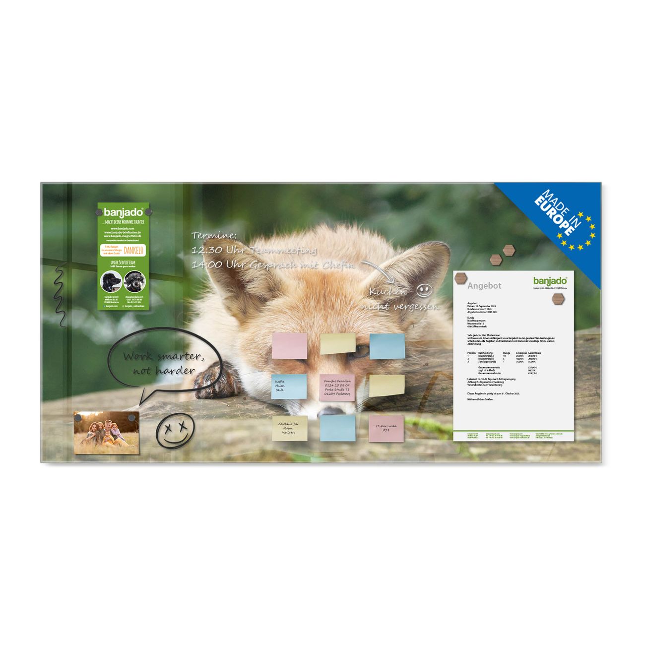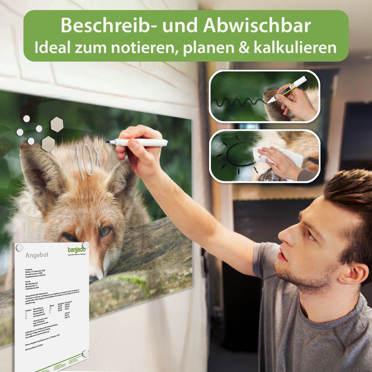 Jede Glas Magnettafel wird in unserer Werkstatt von Hand gefertigt und sorgfältig geprüft. So erhalten Sie ein echtes Qualitätsprodukt, das Funktion und Ästhetik perfekt vereint.?? Warum banjado?