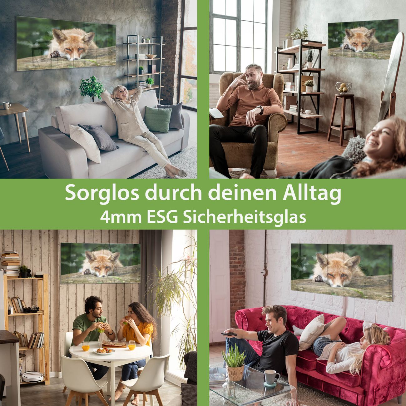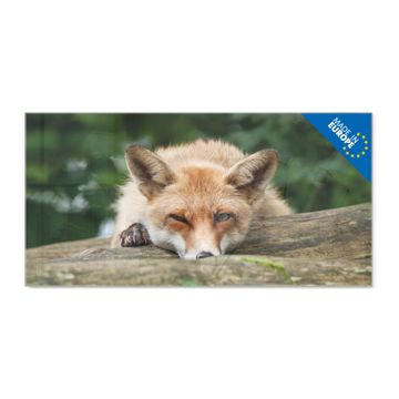 Material: 4mm Sicherheitsglas mit Metallrückwand Eigenschaften: beschreibbar, magnetisch, kratzfest Maße: 100x50x0,6cm, 7,50kg schwer Motiv Nummer 12902 Fuchs Relax Zubehör: inklusive 4 Neodym-Magnete