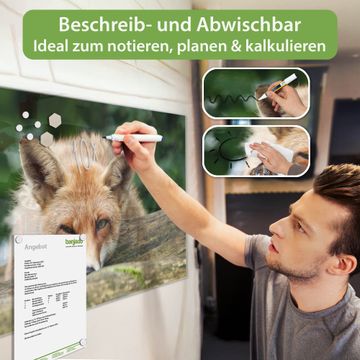 Ein Stück Design, das Ihren Alltag organisiert. Schreiben, heften, inspirieren - alles an einem Ort. Qualität, die man spürt. Montage leicht gemacht. Handwerk mit Herz - veredelt in Sachsen. Einzigartiges Design mit Motiv Motiv Fuchs Relax Beschreibbare Glasoberfläche, leicht zu reinigen Starke Magnetkraft durch Stahlrückwand Inklusive 4 Neodym-Magneten Flexible Montageoptionen Handveredelt in Sachsen - Qualität, die bleibt