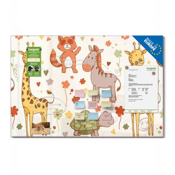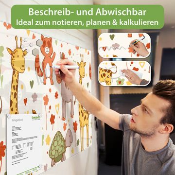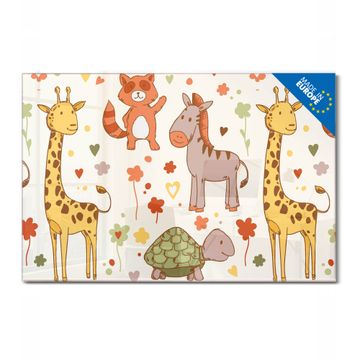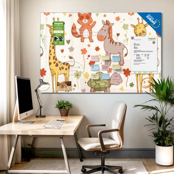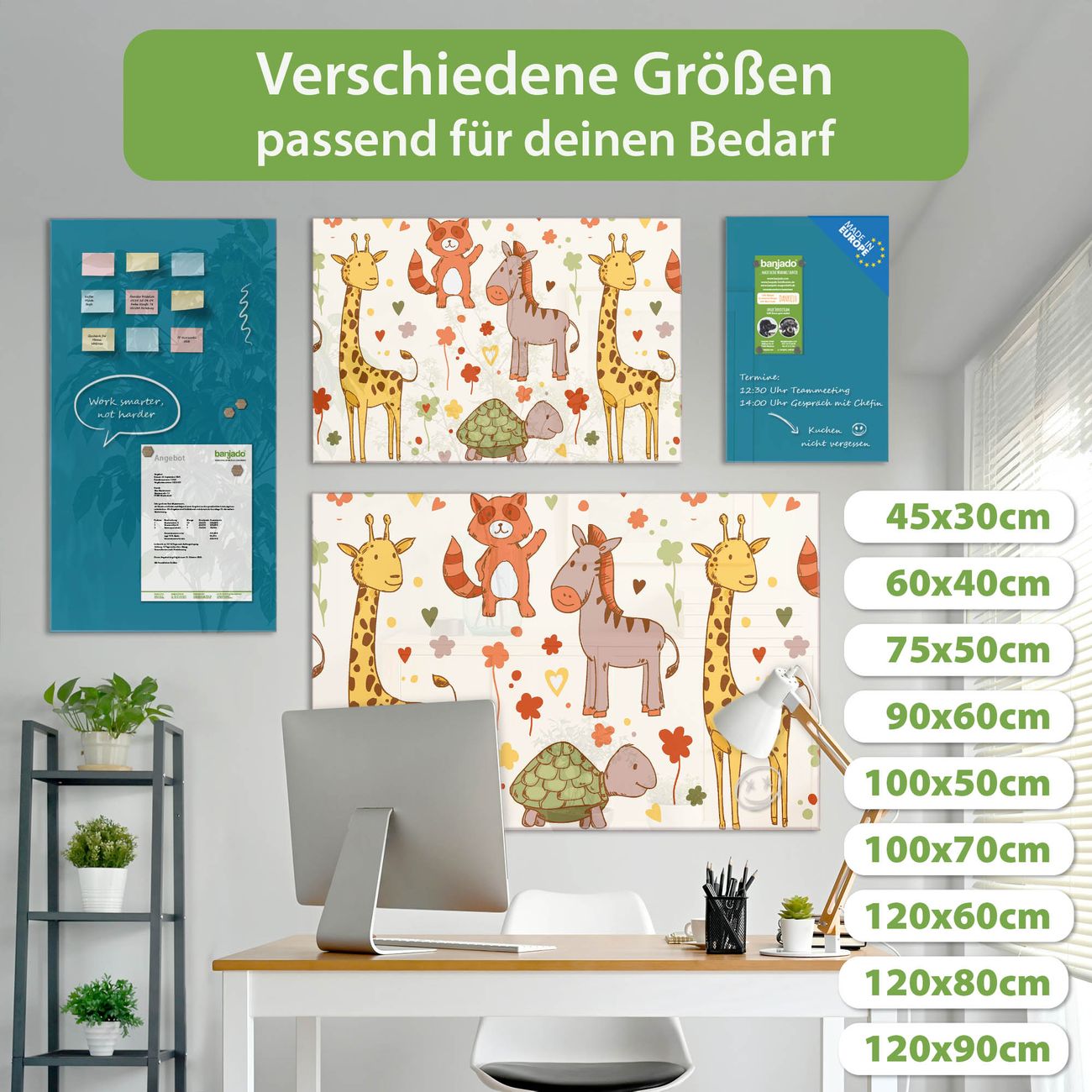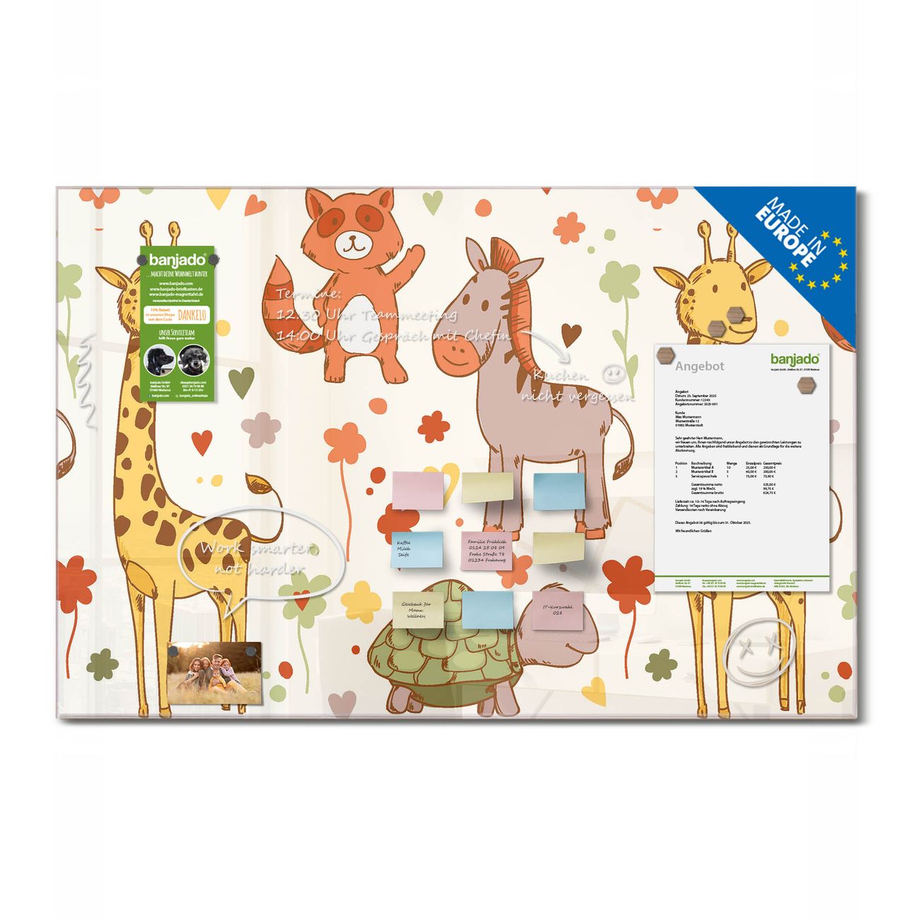 Material: 4mm Sicherheitsglas mit Metallrückwand Eigenschaften: beschreibbar, magnetisch, kratzfest Maße: 120x80x0,6cm, 14,40kg schwer Motiv Nummer 12919 Giraffe & Co Zubehör: inklusive 4 Neodym-Magnete