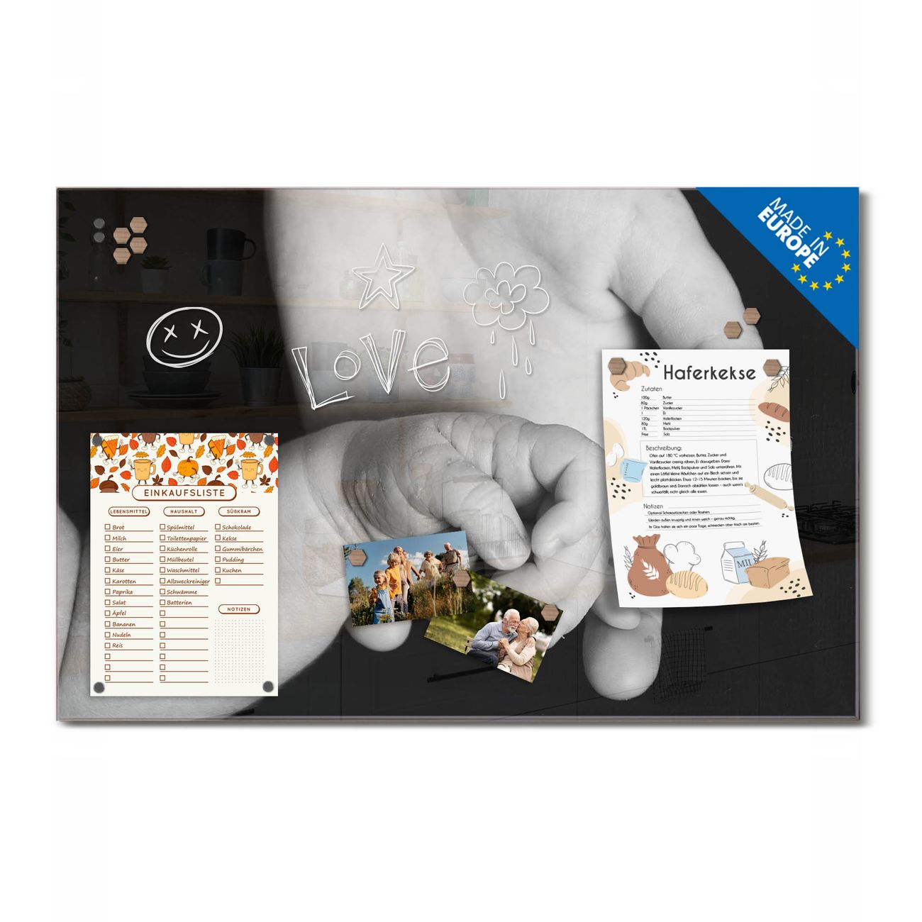 Auf der glatten Glasoberfläche lassen sich Termine, Rezepte oder Notizen ganz einfach mit Kreidestiften festhalten und rückstandslos entfernen. Starke Neodym-Magnete halten Ihre wichtigsten Erinnerungen sicher an Ort und Stelle. So entsteht Ihre ganz persönliche Ideenwand - jeden Tag neu.