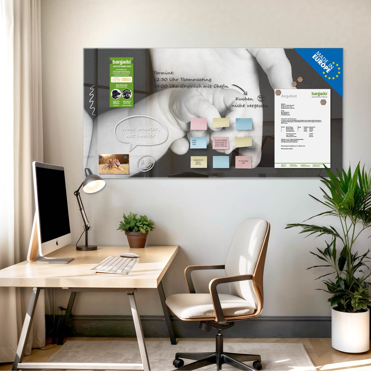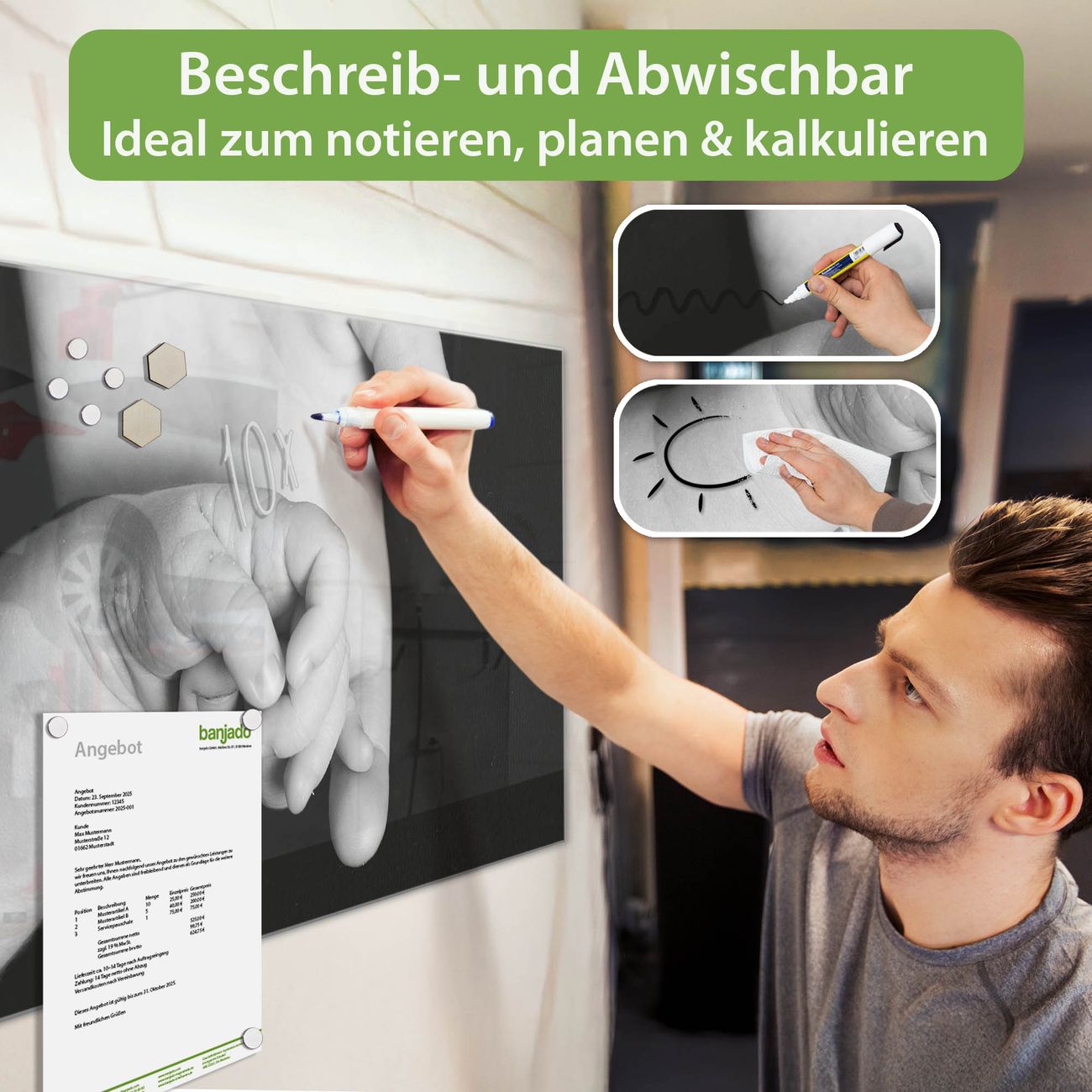 Jede Glas Magnettafel wird in unserer Werkstatt von Hand gefertigt und sorgfältig geprüft. So erhalten Sie ein echtes Qualitätsprodukt, das Funktion und Ästhetik perfekt vereint.?? Warum banjado?