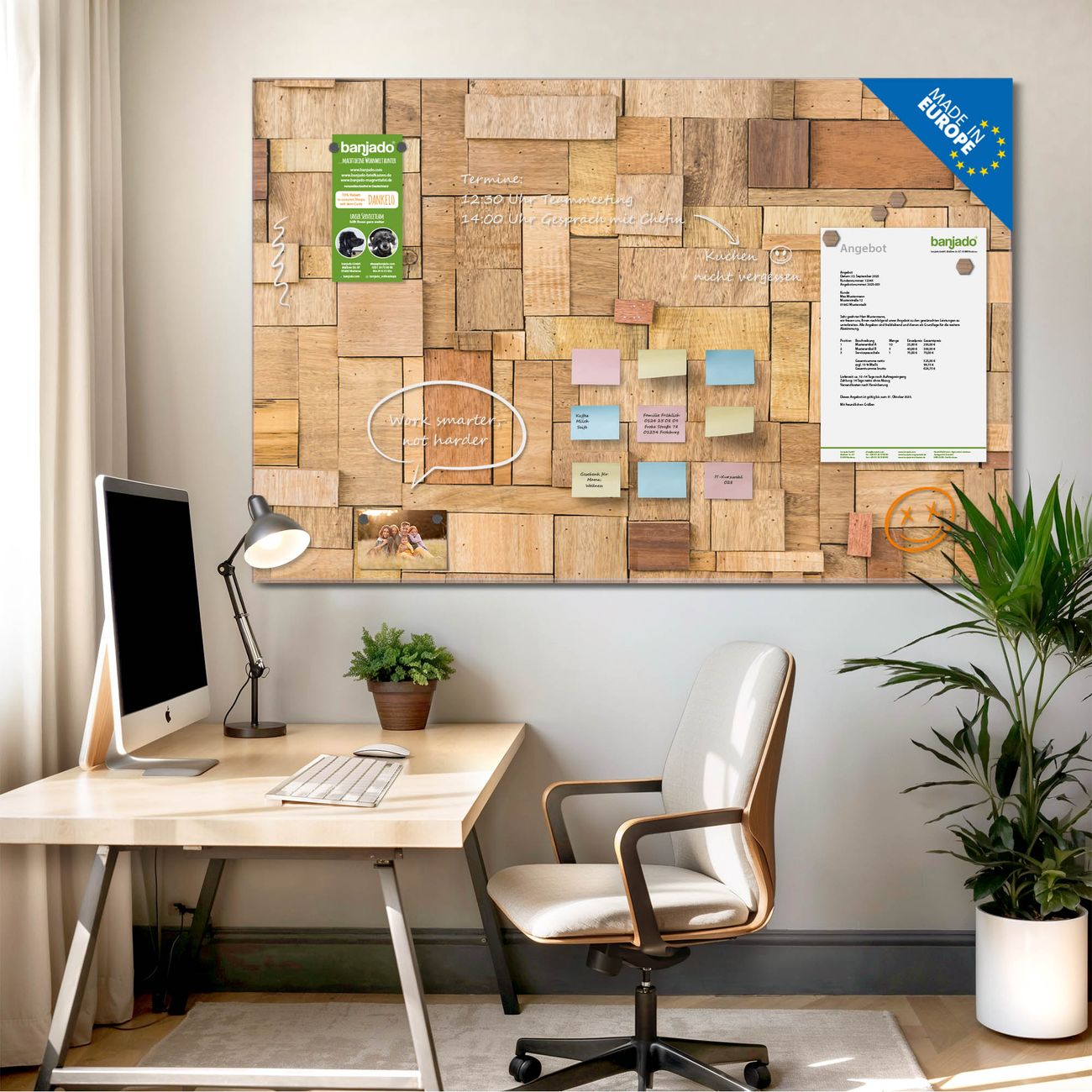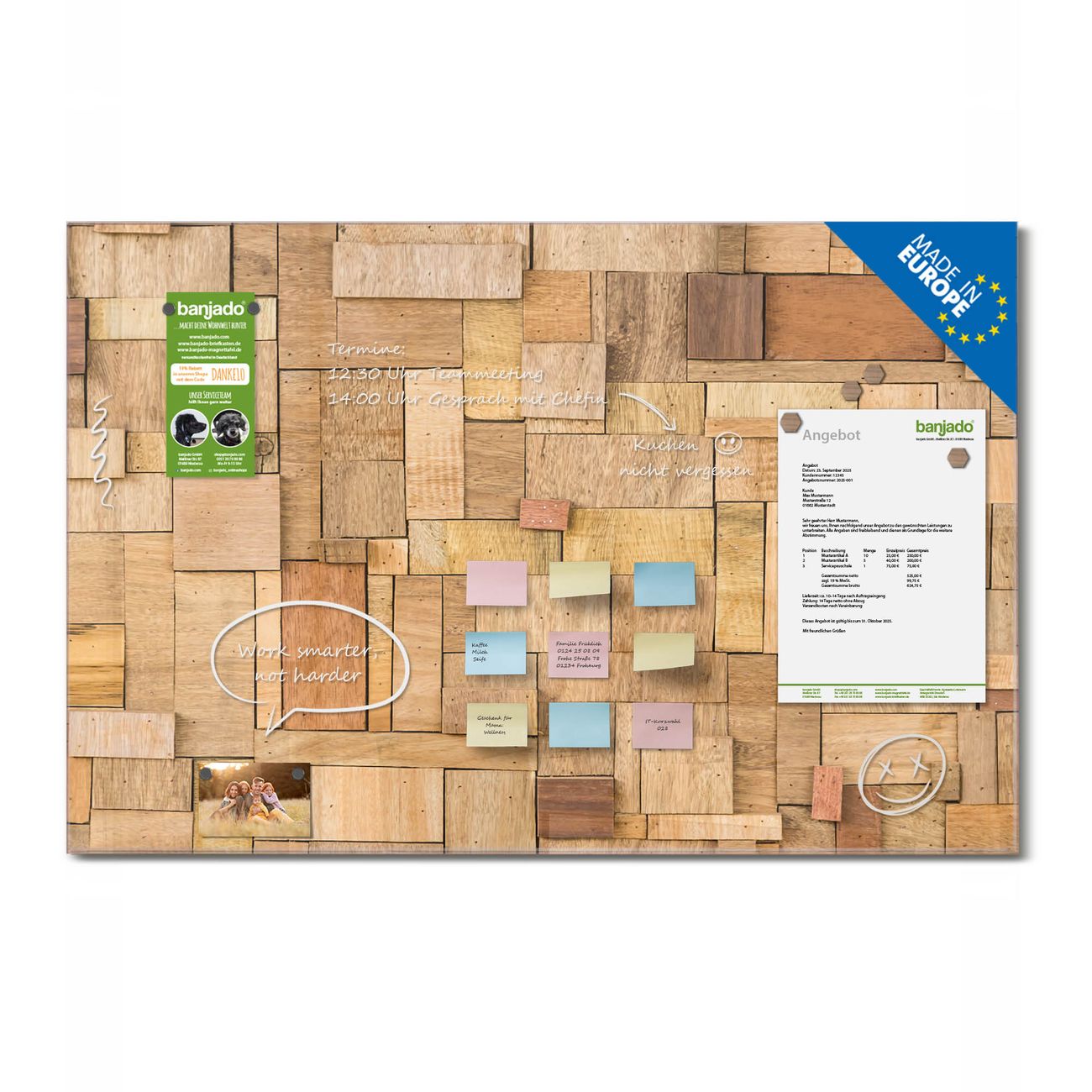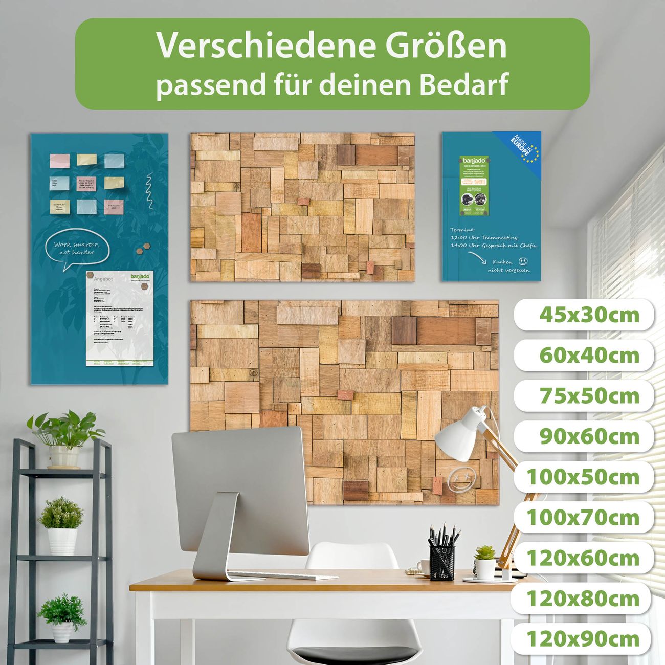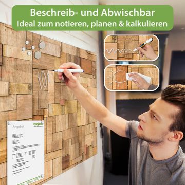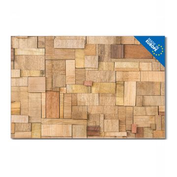 Material: 4mm Sicherheitsglas mit Metallrückwand Eigenschaften: beschreibbar, magnetisch, kratzfest Maße: 90x60x0,6cm, 8,10kg schwer Motiv Nummer 12168 Hölzernes Flickwerk Zubehör: inklusive 4 Neodym-Magnete