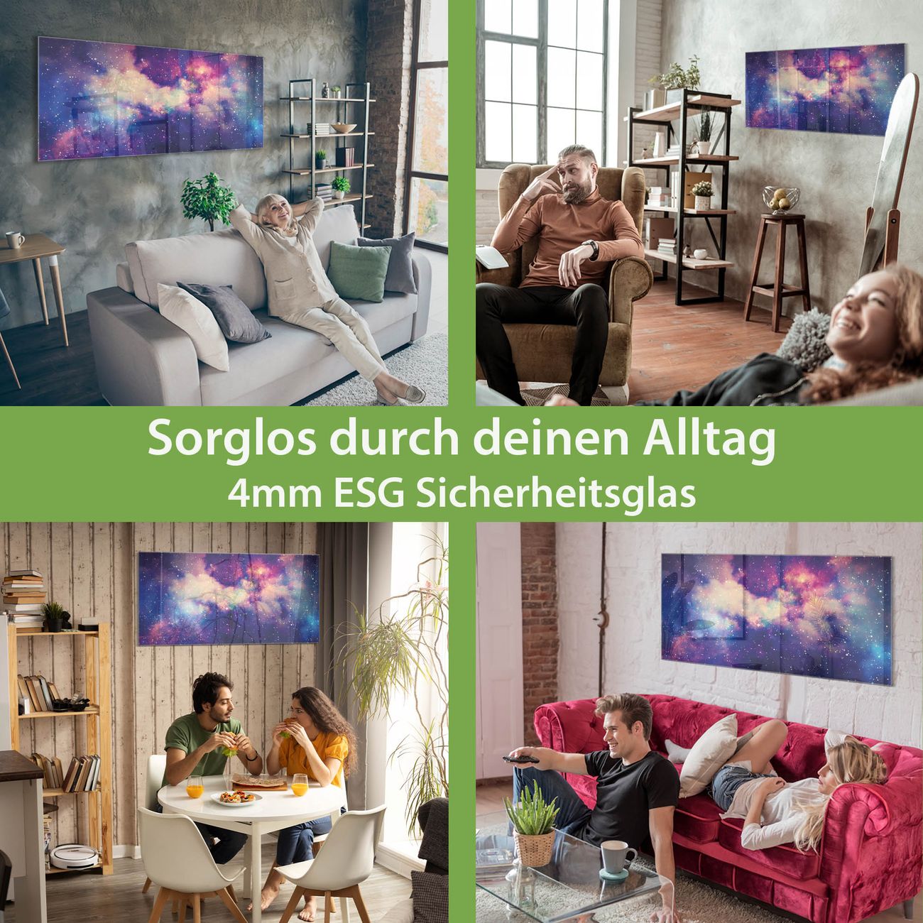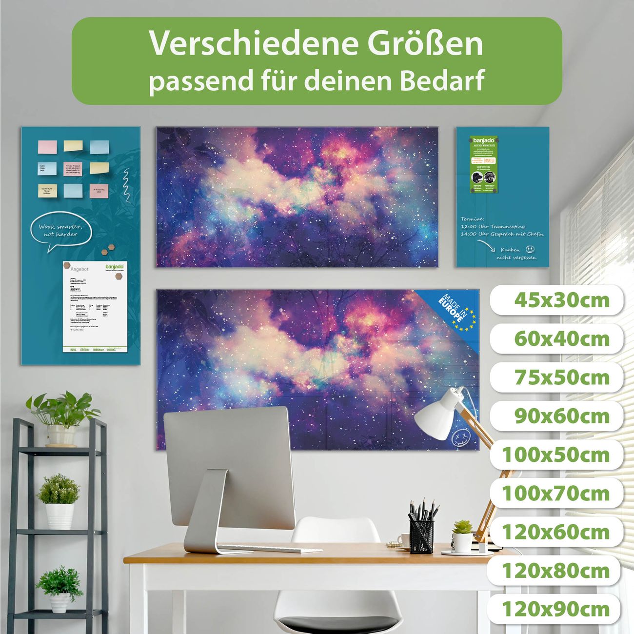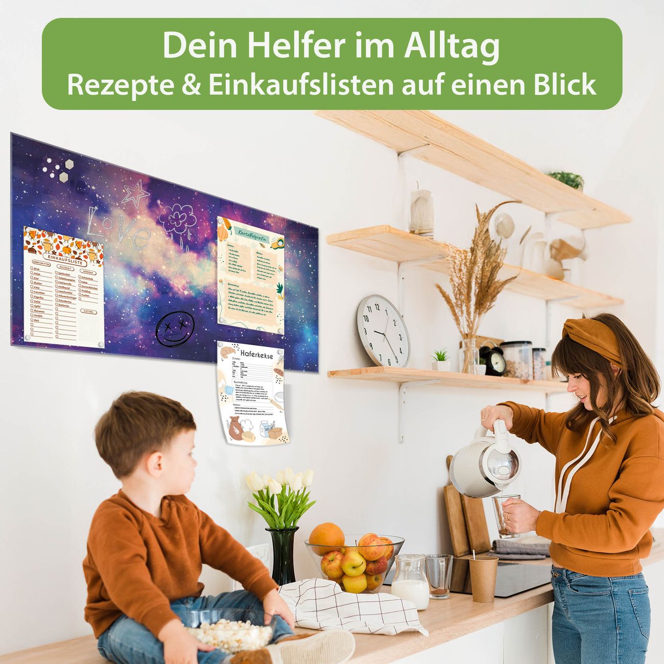 Material: 4mm Sicherheitsglas mit Metallrückwand Eigenschaften: beschreibbar, magnetisch, kratzfest Maße: 100x50x0,6cm, 7,50kg schwer Motiv Nummer 12843 Im Weltall 1 Zubehör: inklusive 4 Neodym-Magnete