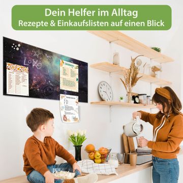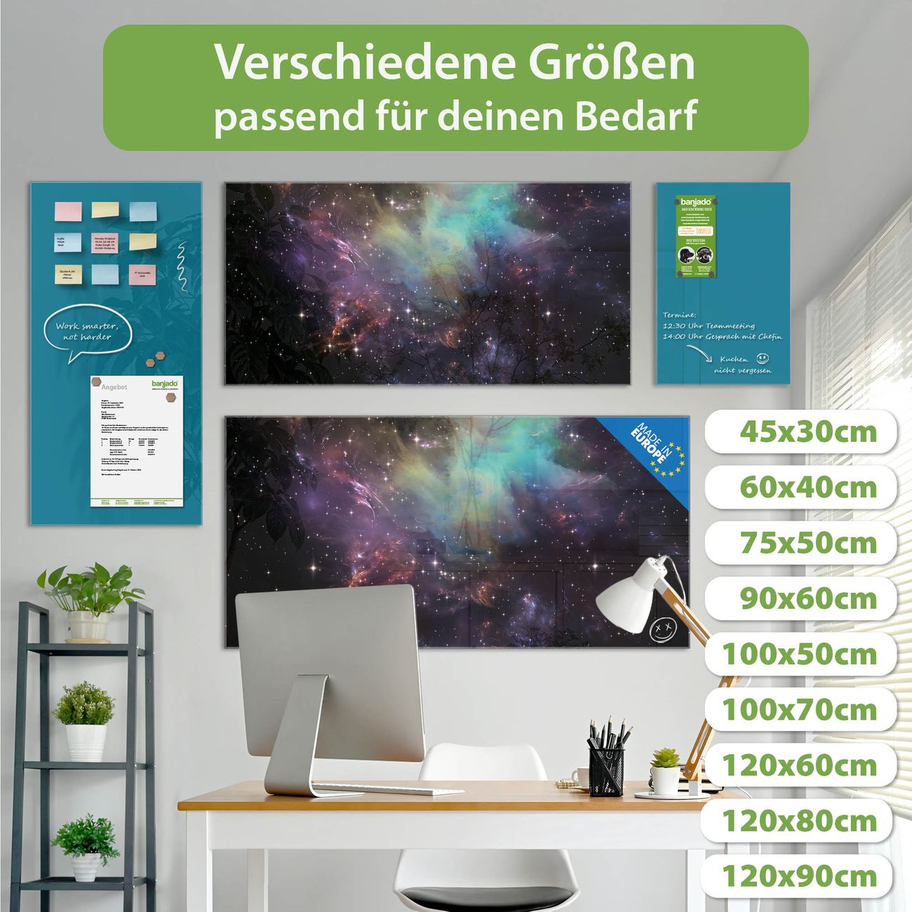 Material: 4mm Sicherheitsglas mit Metallrückwand Eigenschaften: beschreibbar, magnetisch, kratzfest Maße: 100x50x0,6cm, 7,50kg schwer Motiv Nummer 12844 Im Weltall 2 Zubehör: inklusive 4 Neodym-Magnete