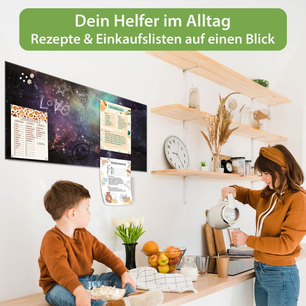 Auf der glatten Glasoberfläche lassen sich Termine, Rezepte oder Notizen ganz einfach mit Kreidestiften festhalten und rückstandslos entfernen. Starke Neodym-Magnete halten Ihre wichtigsten Erinnerungen sicher an Ort und Stelle. So entsteht Ihre ganz persönliche Ideenwand - jeden Tag neu.