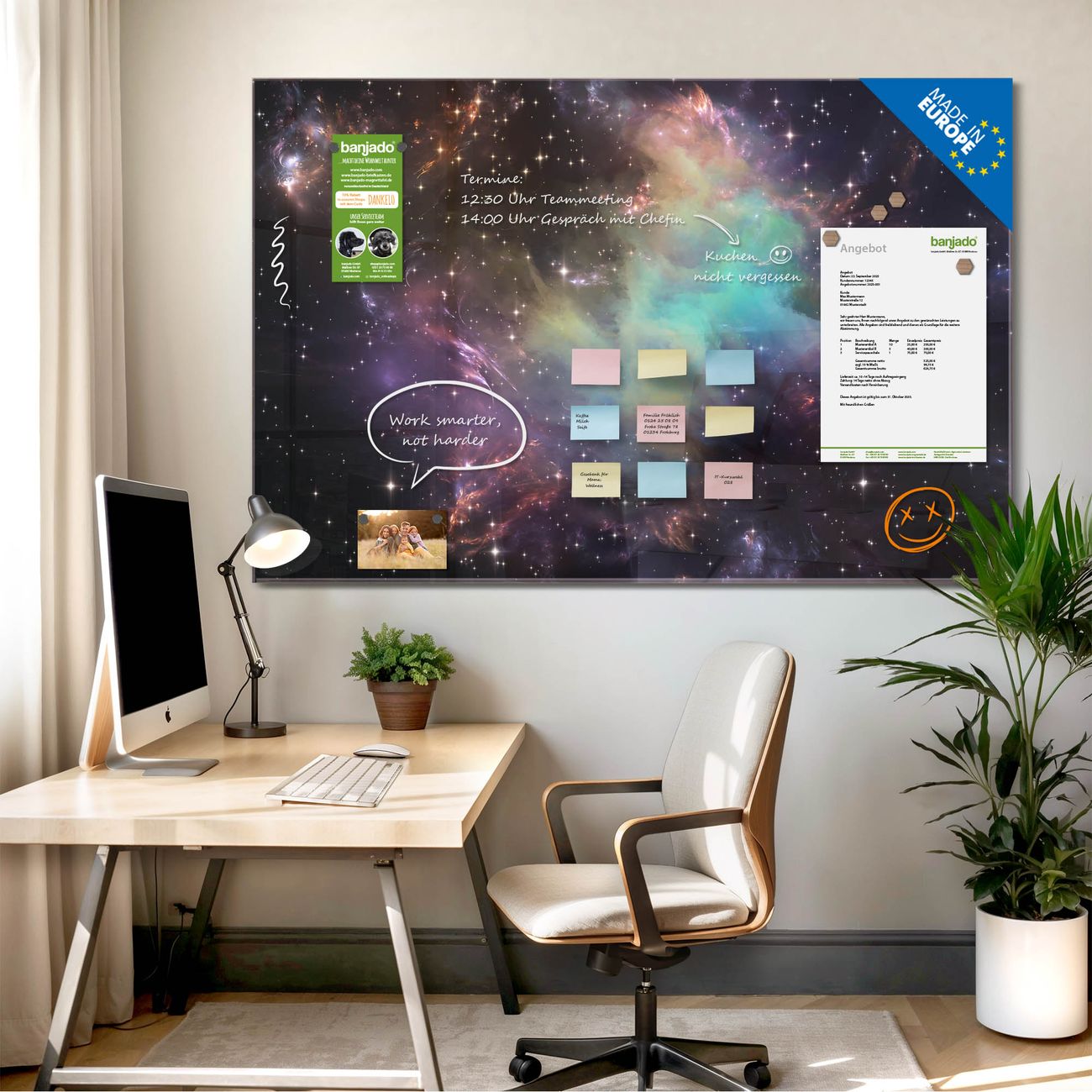 Jede Glas Magnettafel wird in unserer Werkstatt von Hand gefertigt und sorgfältig geprüft. So erhalten Sie ein echtes Qualitätsprodukt, das Funktion und Ästhetik perfekt vereint.?? Warum banjado?