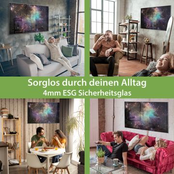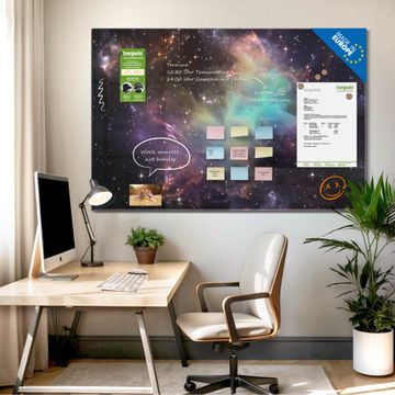 Material: 4mm Sicherheitsglas mit Metallrückwand Eigenschaften: beschreibbar, magnetisch, kratzfest Maße: 120x80x0,6cm, 14,40kg schwer Motiv Nummer 12844 Im Weltall 2 Zubehör: inklusive 4 Neodym-Magnete
