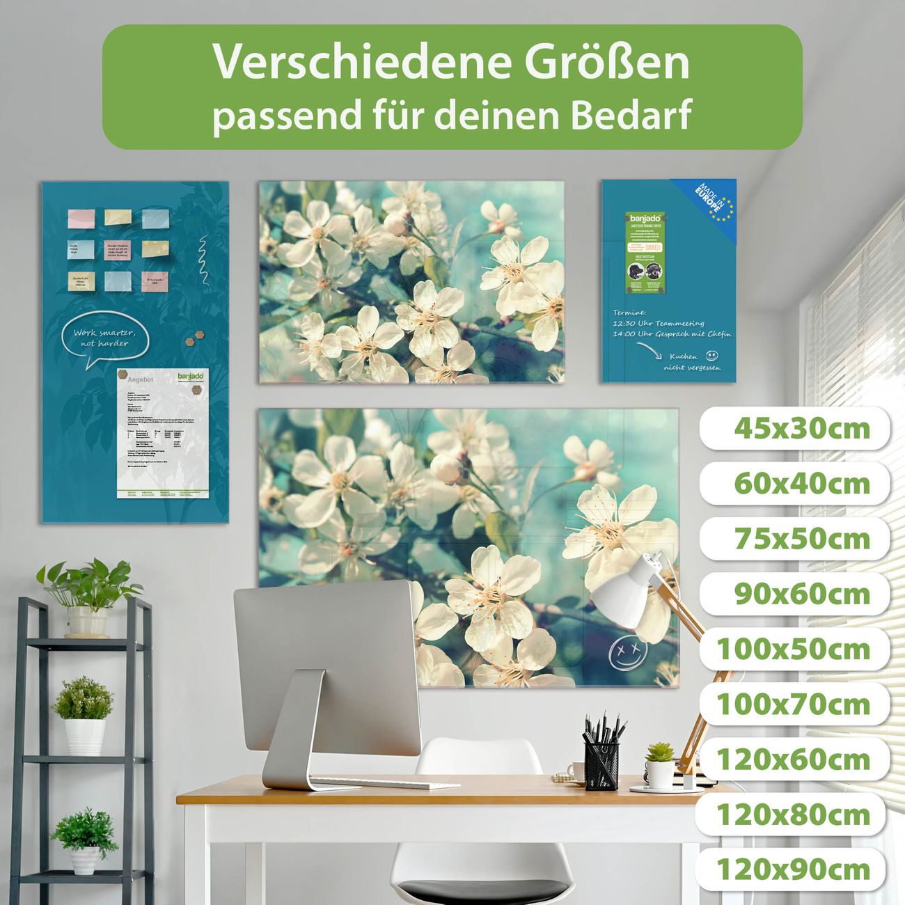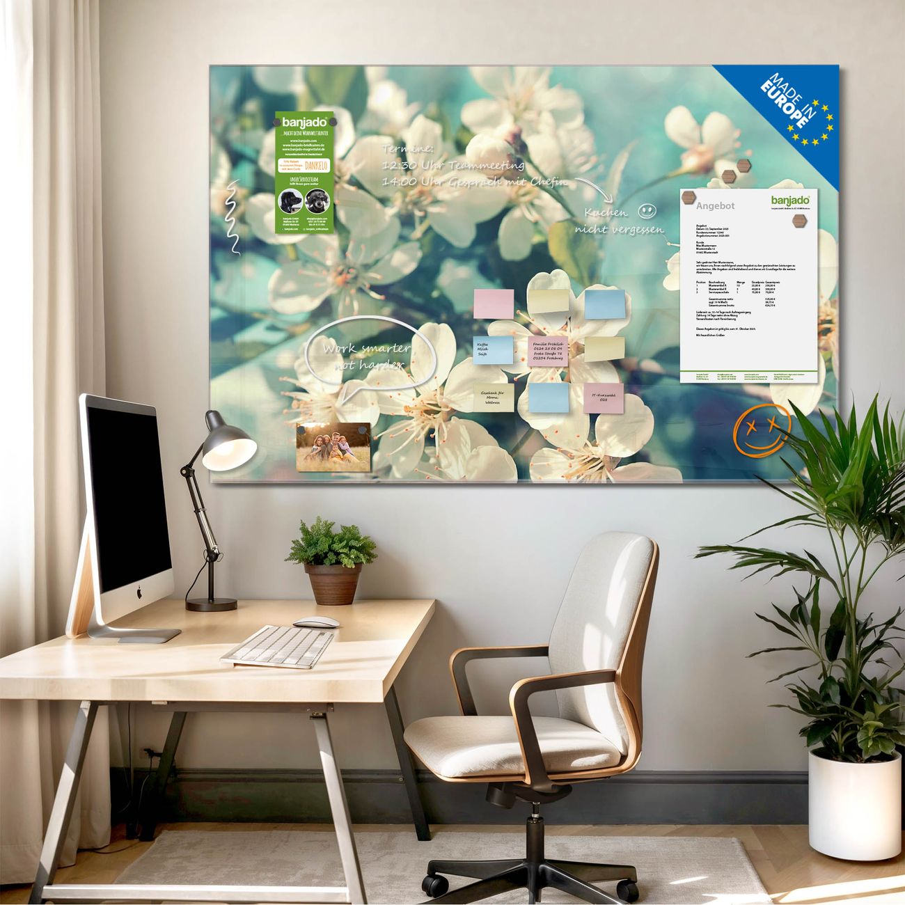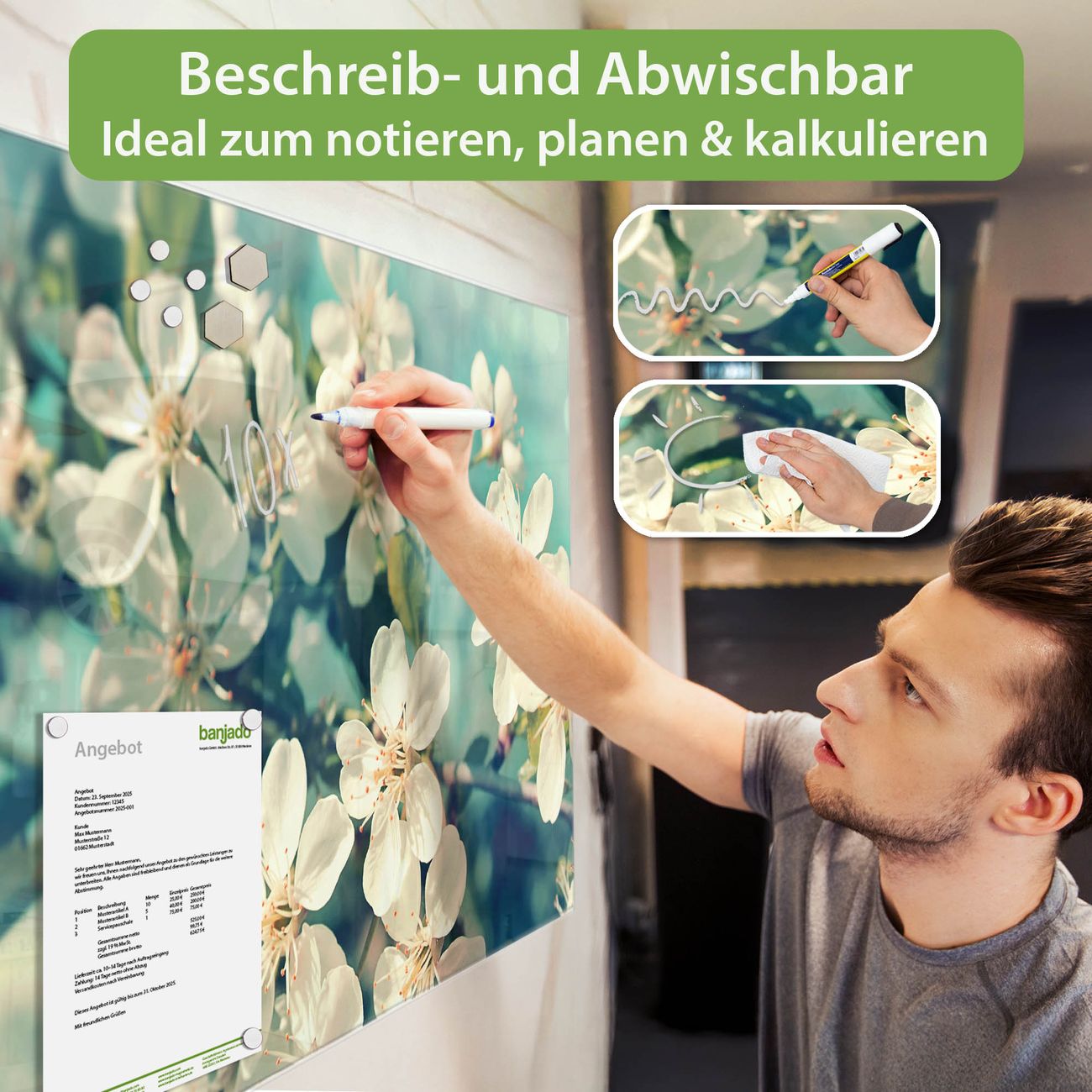 Jede Glas Magnettafel wird in unserer Werkstatt von Hand gefertigt und sorgfältig geprüft. So erhalten Sie ein echtes Qualitätsprodukt, das Funktion und Ästhetik perfekt vereint.?? Warum banjado?