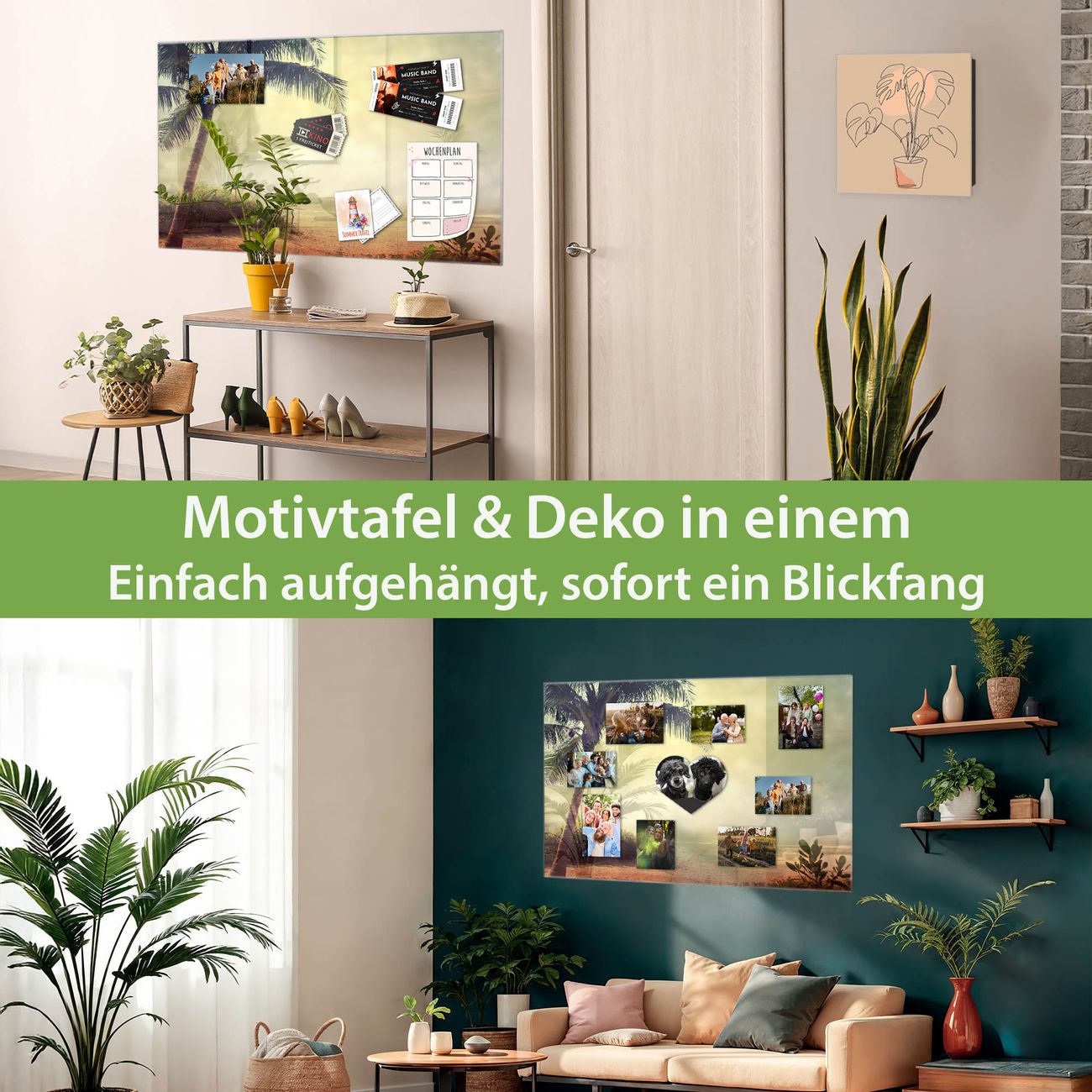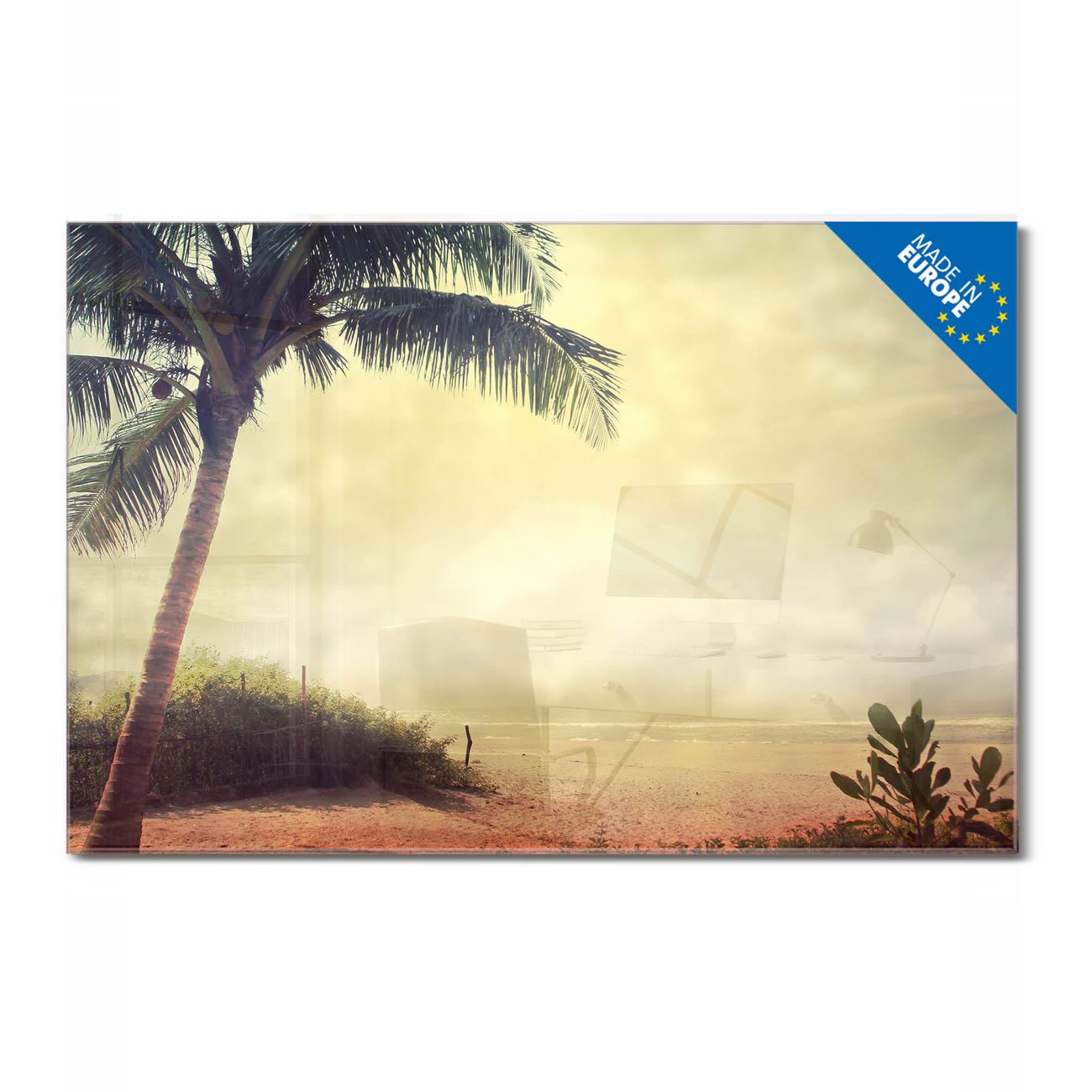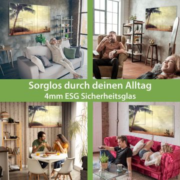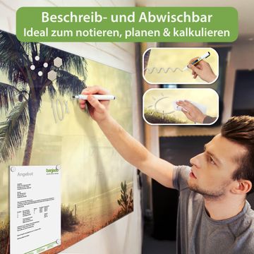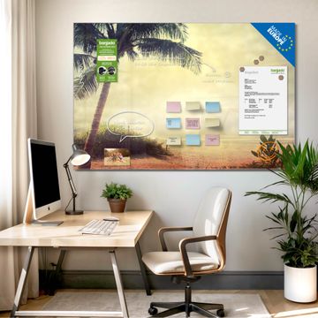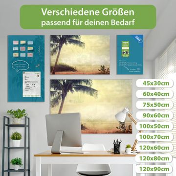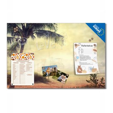 Material: 4mm Sicherheitsglas mit Metallrückwand Eigenschaften: beschreibbar, magnetisch, kratzfest Maße: 75x50x0,6cm, 5,63kg schwer Motiv Nummer 12909 Palme am Strand Zubehör: inklusive 4 Neodym-Magnete