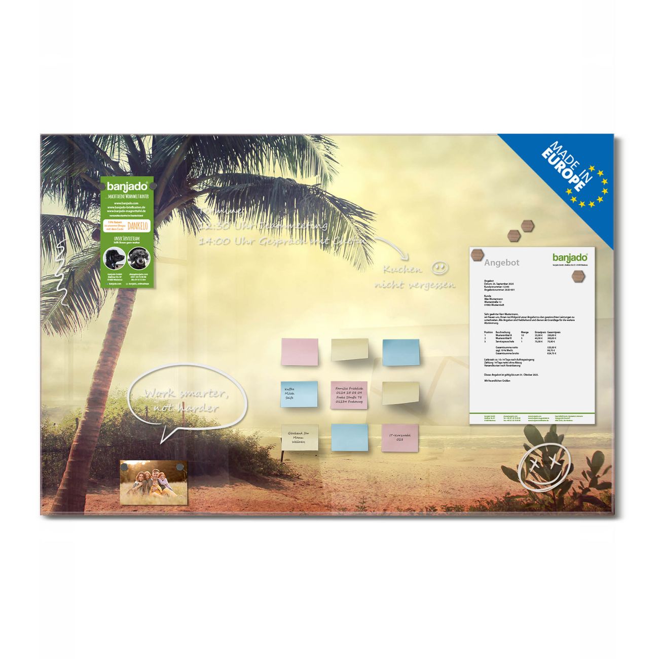 Jede Glas Magnettafel wird in unserer Werkstatt von Hand gefertigt und sorgfältig geprüft. So erhalten Sie ein echtes Qualitätsprodukt, das Funktion und Ästhetik perfekt vereint.?? Warum banjado?