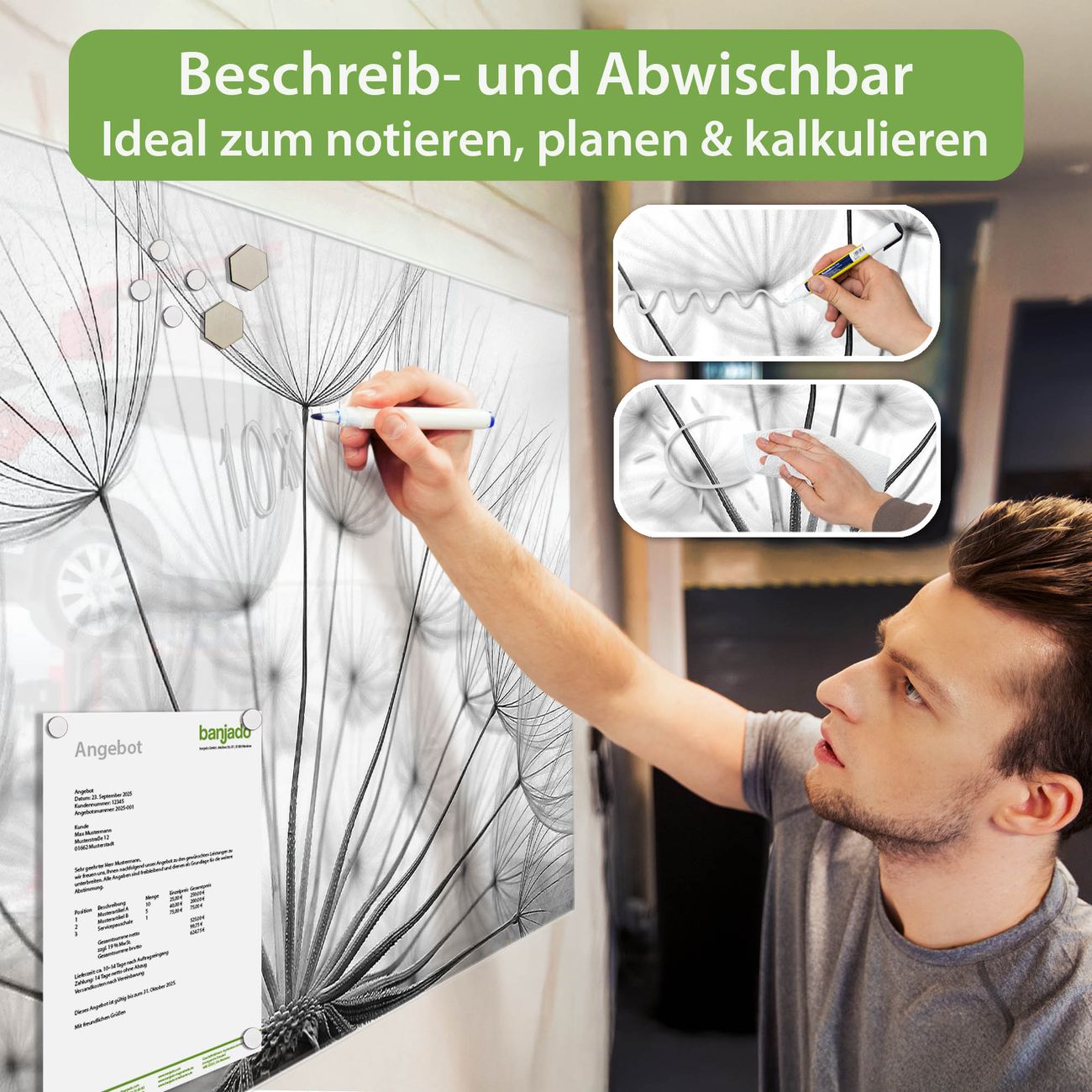 Auf der glatten Glasoberfläche lassen sich Termine, Rezepte oder Notizen ganz einfach mit Kreidestiften festhalten und rückstandslos entfernen. Starke Neodym-Magnete halten Ihre wichtigsten Erinnerungen sicher an Ort und Stelle. So entsteht Ihre ganz persönliche Ideenwand - jeden Tag neu.