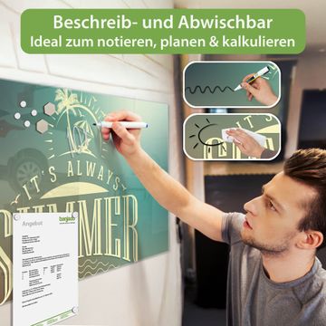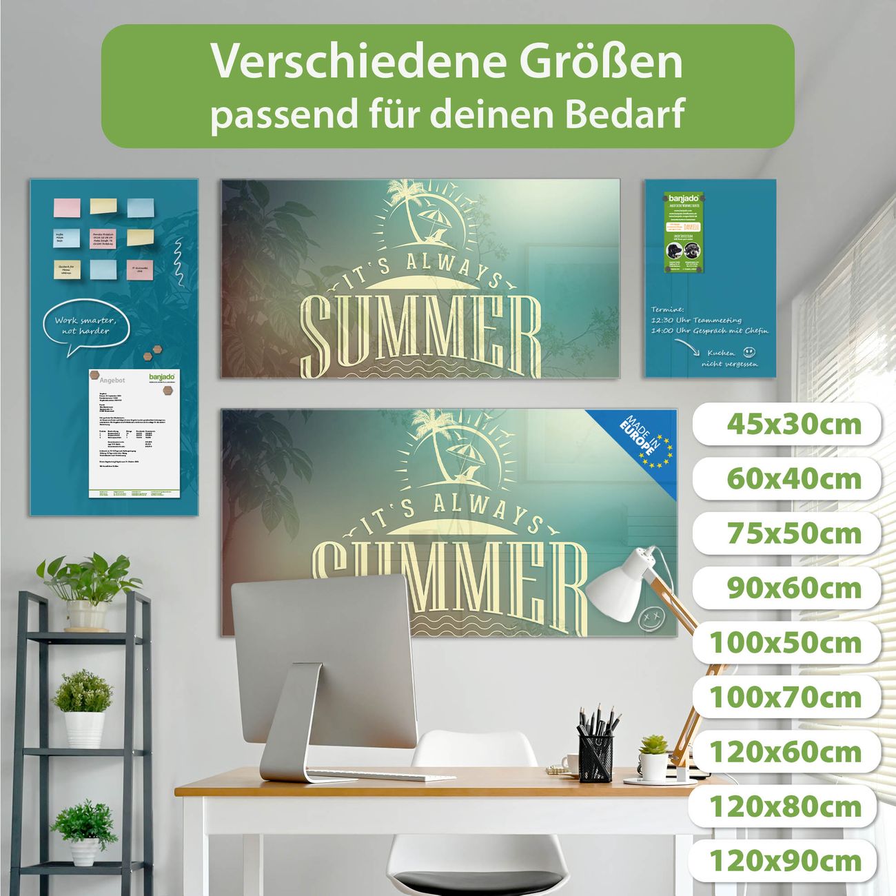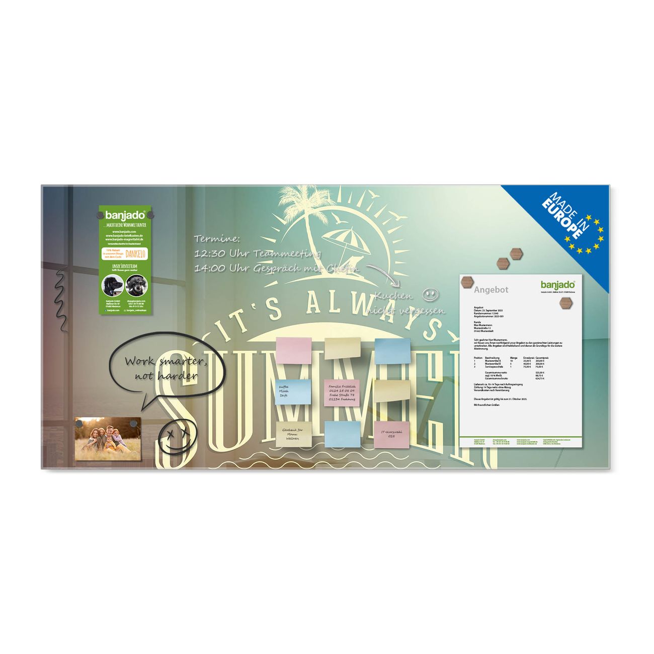 Material: 4mm Sicherheitsglas mit Metallrückwand Eigenschaften: beschreibbar, magnetisch, kratzfest Maße: 100x50x0,6cm, 7,50kg schwer Motiv Nummer 12896 Sommer Heart Zubehör: inklusive 4 Neodym-Magnete