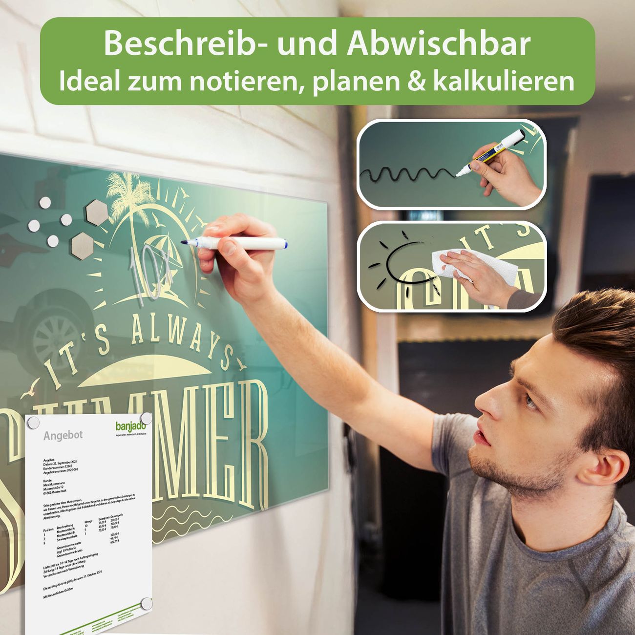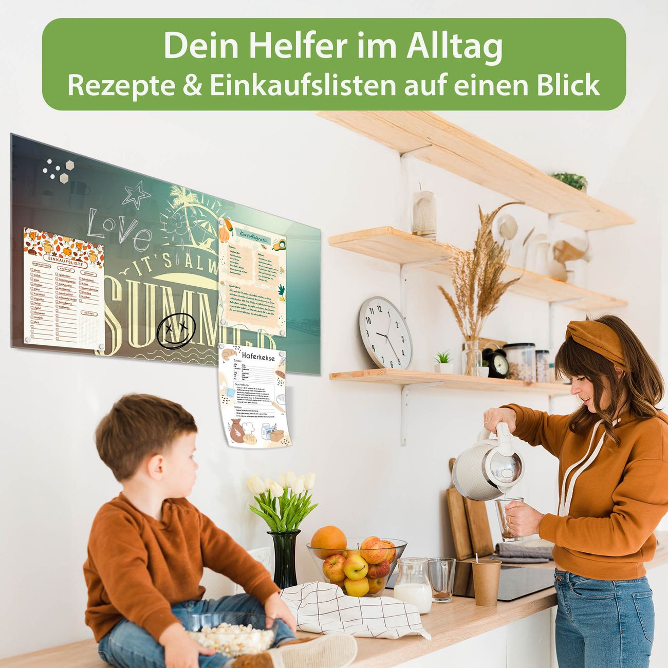 Auf der glatten Glasoberfläche lassen sich Termine, Rezepte oder Notizen ganz einfach mit Kreidestiften festhalten und rückstandslos entfernen. Starke Neodym-Magnete halten Ihre wichtigsten Erinnerungen sicher an Ort und Stelle. So entsteht Ihre ganz persönliche Ideenwand - jeden Tag neu.