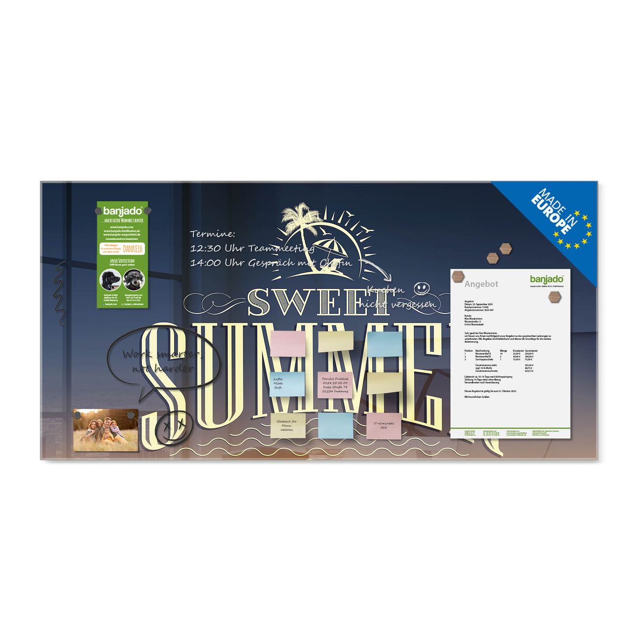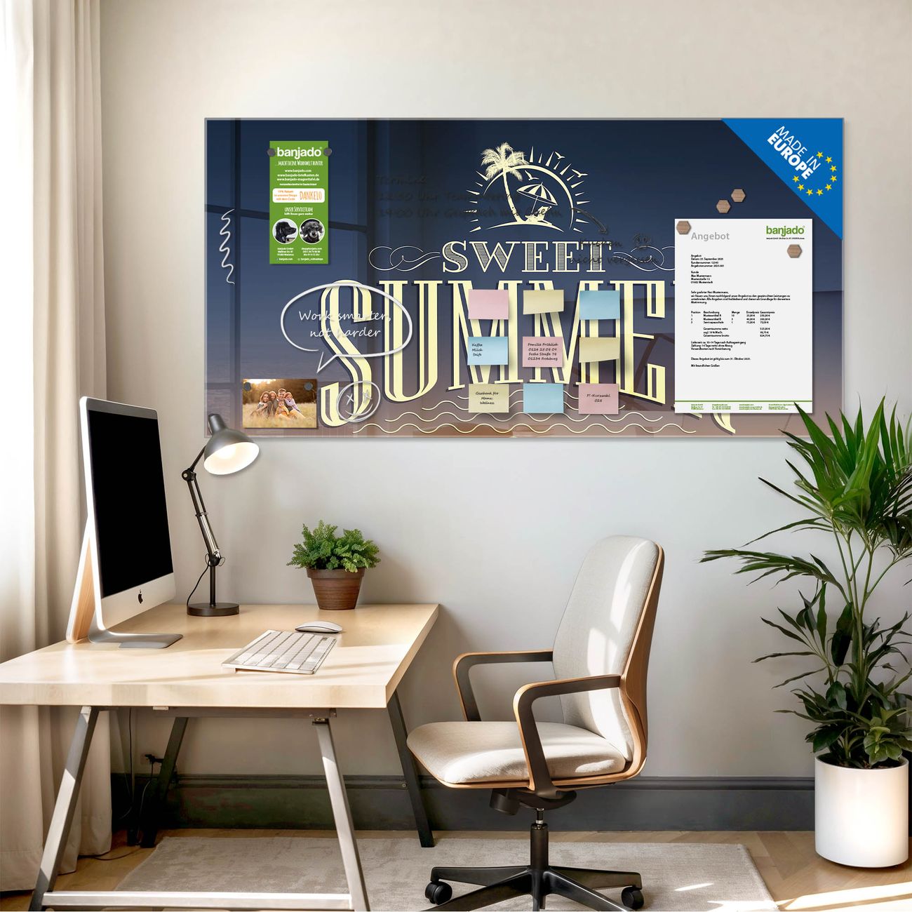 Jede Glas Magnettafel wird in unserer Werkstatt von Hand gefertigt und sorgfältig geprüft. So erhalten Sie ein echtes Qualitätsprodukt, das Funktion und Ästhetik perfekt vereint.?? Warum banjado?