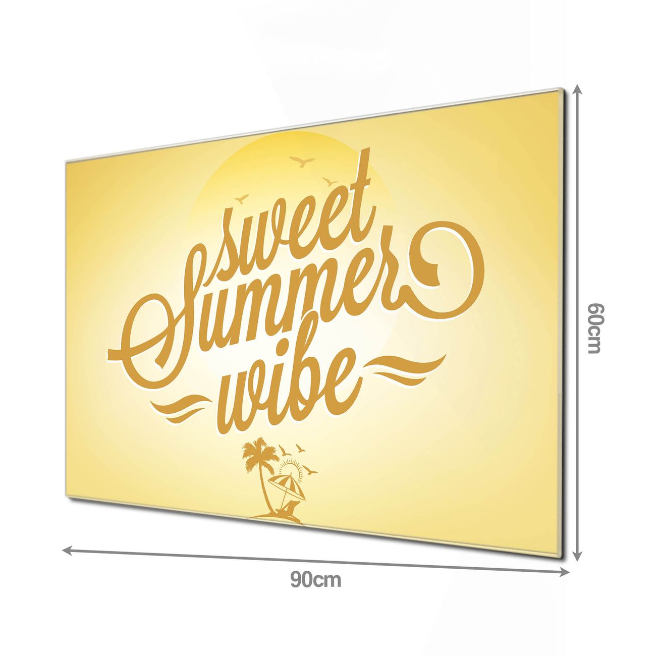 Material: 4mm Sicherheitsglas mit Metallrückwand Eigenschaften: beschreibbar, magnetisch, kratzfest Maße: 90x60x0,6cm, 8,10kg schwer Motiv Nummer 12897 Summer Wibe Zubehör: inklusive 4 Neodym-Magnete