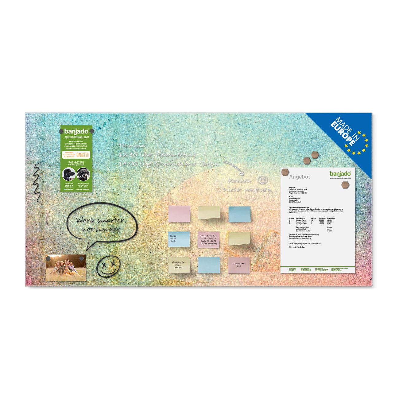 Material: 4mm Sicherheitsglas mit Metallrückwand Eigenschaften: beschreibbar, magnetisch, kratzfest Maße: 100x50x0,6cm, 7,50kg schwer Motiv Nummer 12891 Zerkratzt 2 Zubehör: inklusive 4 Neodym-Magnete