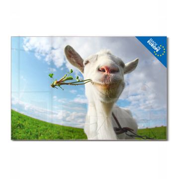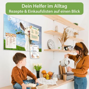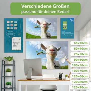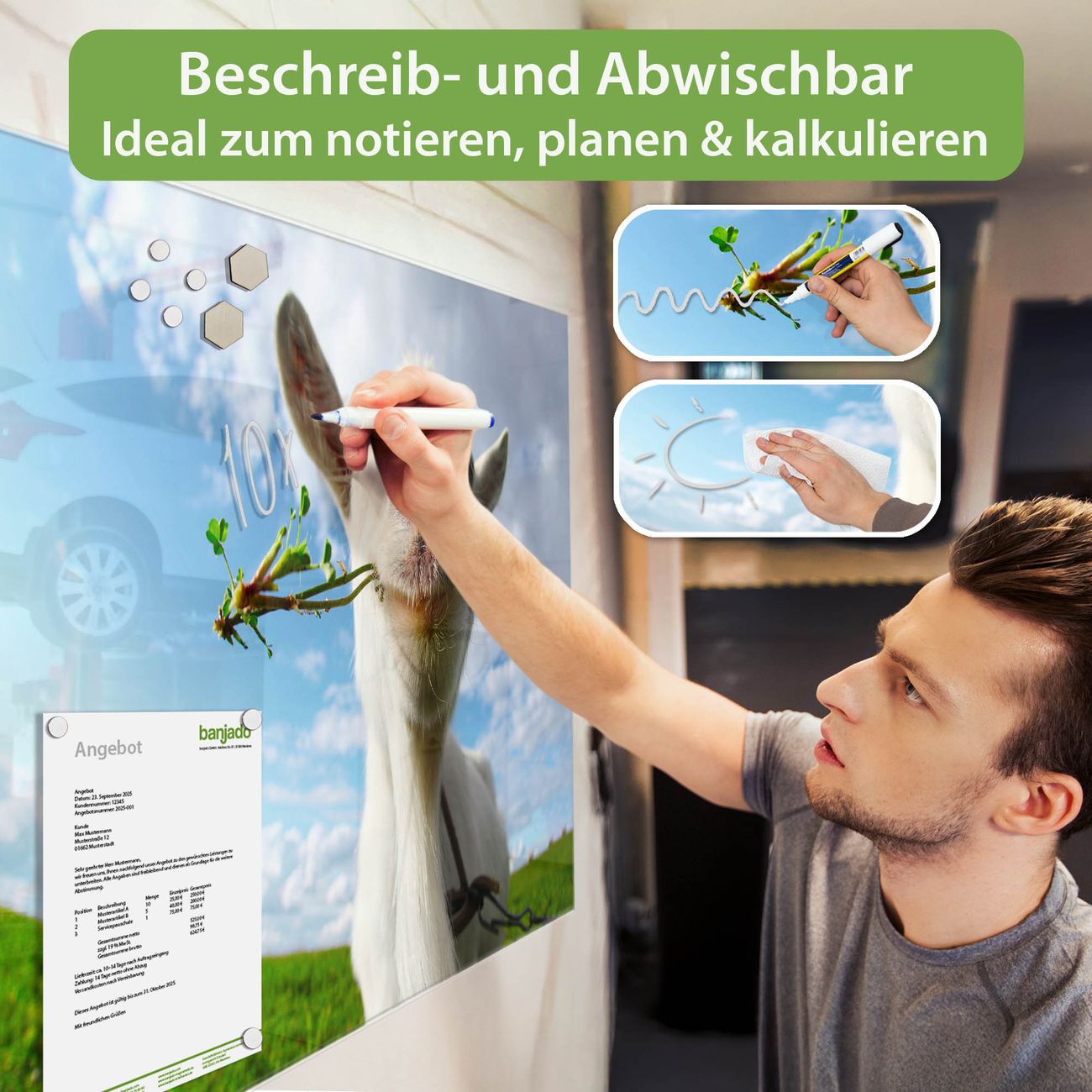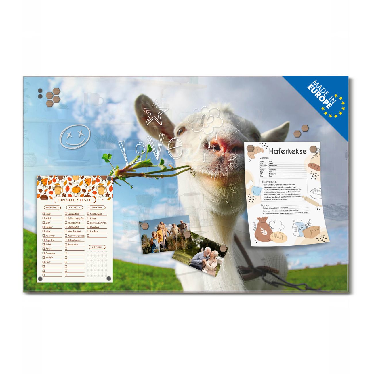 Material: 4mm Sicherheitsglas mit Metallrückwand Eigenschaften: beschreibbar, magnetisch, kratzfest Maße: 45x30x0,6cm, 2,03kg schwer Motiv Nummer 12910 Ziege 2 Zubehör: inklusive 4 Neodym-Magnete