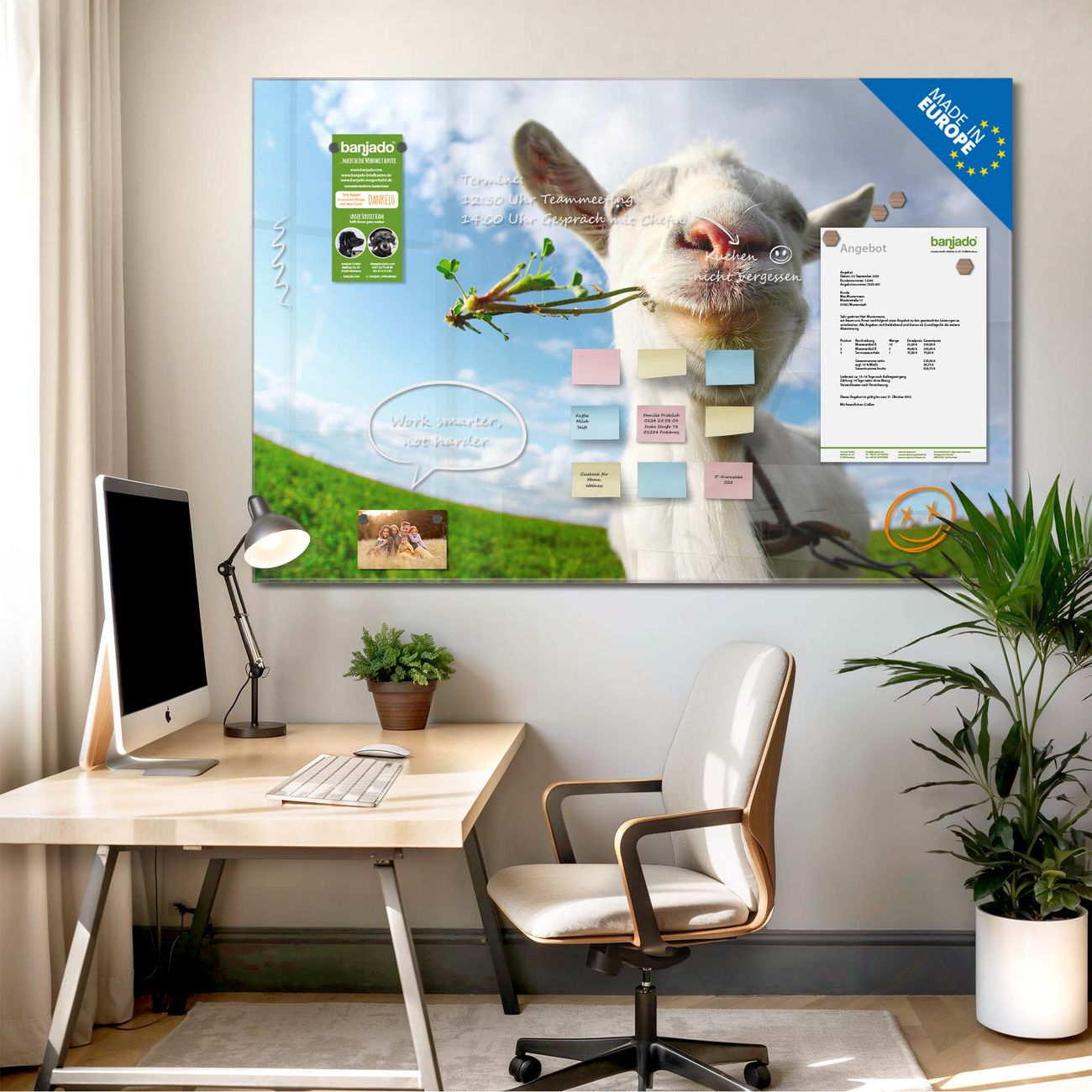 Die banjado Glas Magnettafel mit dem Motiv Motiv Ziege 2 verbindet Funktionalität mit Stil. Sie ersetzt das Zettelchaos durch klare Strukturen und bringt dabei eine warme, natürliche Atmosphäre in Ihr Zuhause. Ob im Büro, in der Küche oder im Eingangsbereich - dieses Design-Board zieht Blicke an und sorgt für Ordnung mit Charakter.