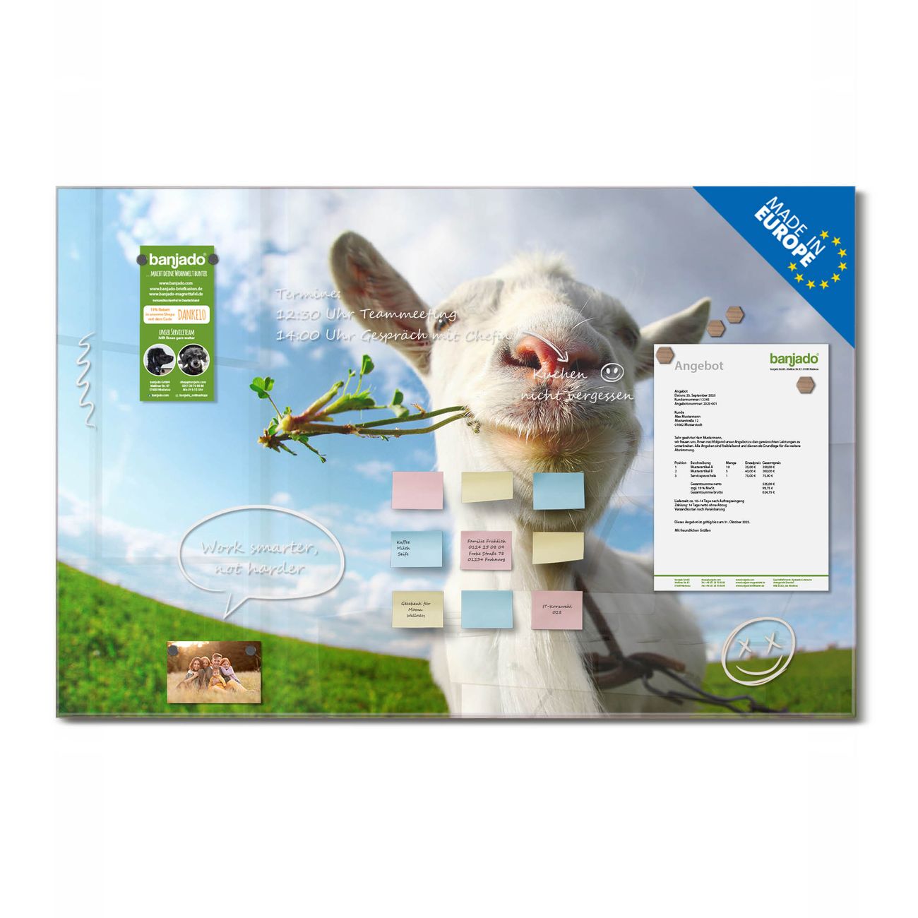 Material: 4mm Sicherheitsglas mit Metallrückwand Eigenschaften: beschreibbar, magnetisch, kratzfest Maße: 120x80x0,6cm, 14,40kg schwer Motiv Nummer 12910 Ziege 2 Zubehör: inklusive 4 Neodym-Magnete