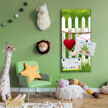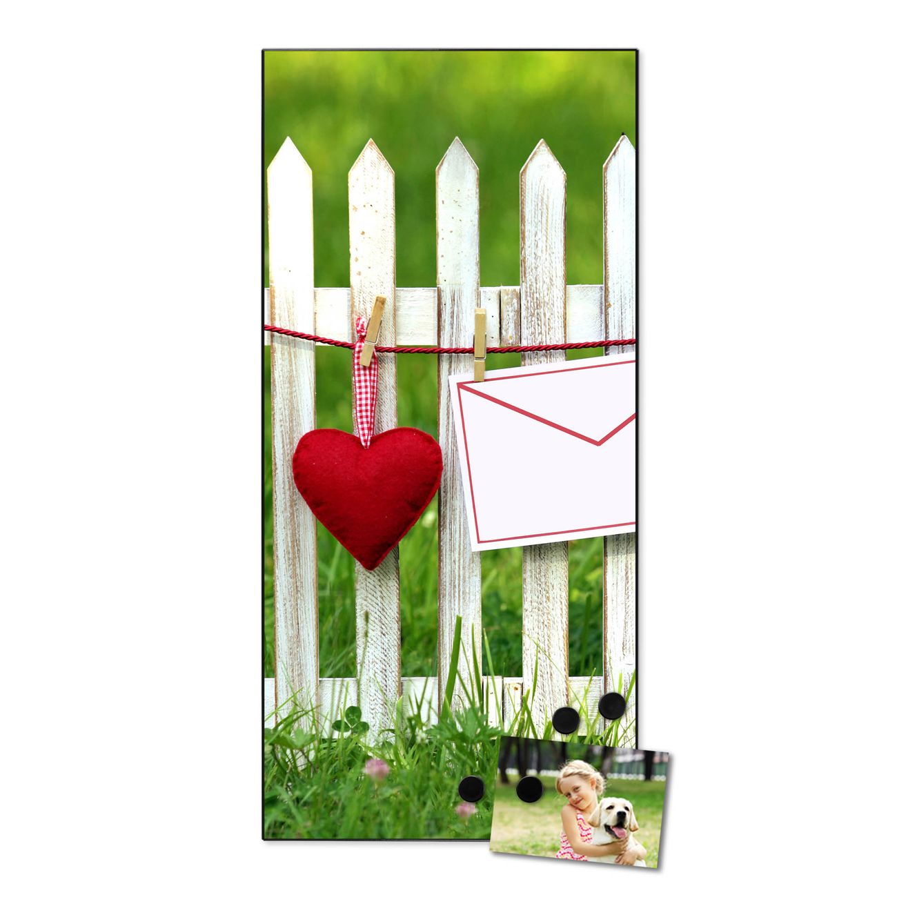 FUNKTION:  Die banjado Magnettafel mit Motiv Gartenzaun Motiv bringt Ordnung in Ihr Zettelchaos. Fotos, Termine, Notizen oder Rezepte lassen Sich hier stilvoll mit Magneten ordnen, Sie behalten alles im Blick. An der Design Magnettafel halten alle handesüblichen Magnete. DESIGN:  Die magnetische Pinnwand mit dem Motiv Motiv Gartenzaun ist ein eleganter Begleiter im Alltag. Mit dieser Memotafel aus Metall haben Sie auch ohne Notizen und Magnete ein schönes Dekoelement. Das Format bietet Ihnen ausreichend Platz um alle wichtigen Informationen im Blick zu behalten. DETAILS:  Die Magnettafel besteht aus silber-grau, weiß oder schwarzlackiertem Stahl. Sie hat eine Größe von 37 x 78 x 2cm. Es befinden sich auf der Rückseite vorgefertigte Aufhängungen die eine schnelle und unkomplizierte Anbringung ermöglichen. Das Motiv ist mit einem seidenmatten Laminat versehen und schützt so zusätzlich vor Kratzern. NUTZEN:  Sie können dieses Memoboard groß als Wandbild nutzen, es halten alle handelsüblichen Magneten daran. Die Pinnwand ist mit einem feuchten Lappen oder Schwamm abwischbar. Sie finden bei uns eine große Auswahl an passenden Magneten. BANJADO:  Wir sind ein kleines Team aus dem Herzen von Sachsen. Wir fertigen alle Artikel von Hand für Sie an, Sie erhalten keine preiswerte Importware. Auf Wunsch können Sie auch Ihr eigenes Foto auf die Magnettafel aufbringen, schreiben Sie uns an. Herzlichst, Ihr banjado-Team