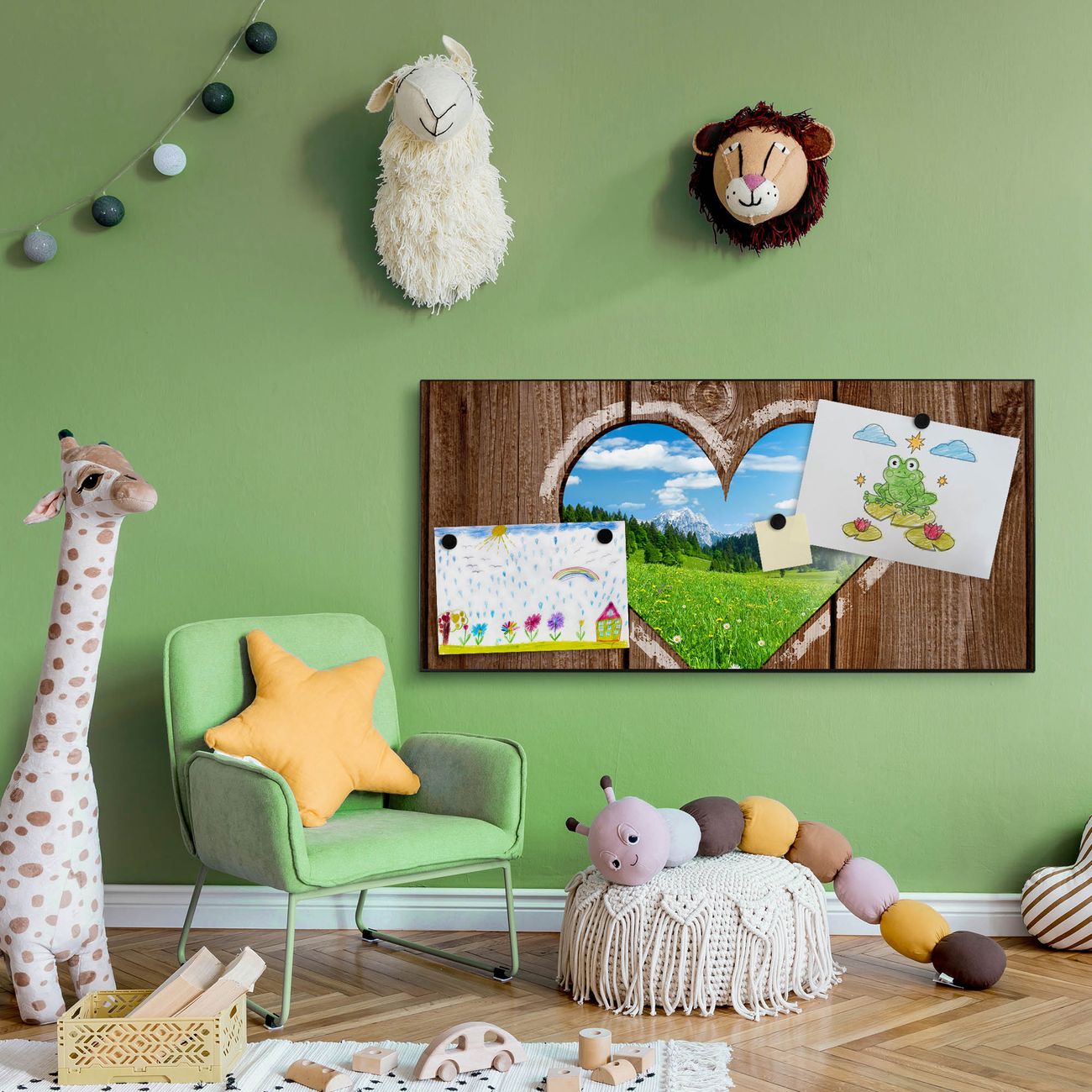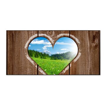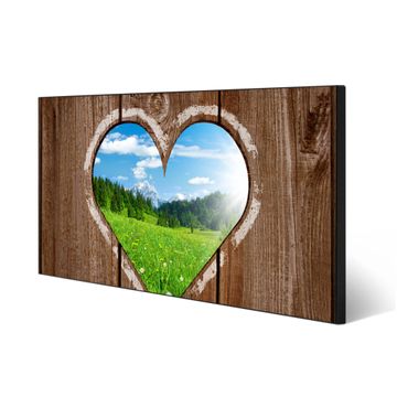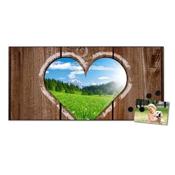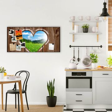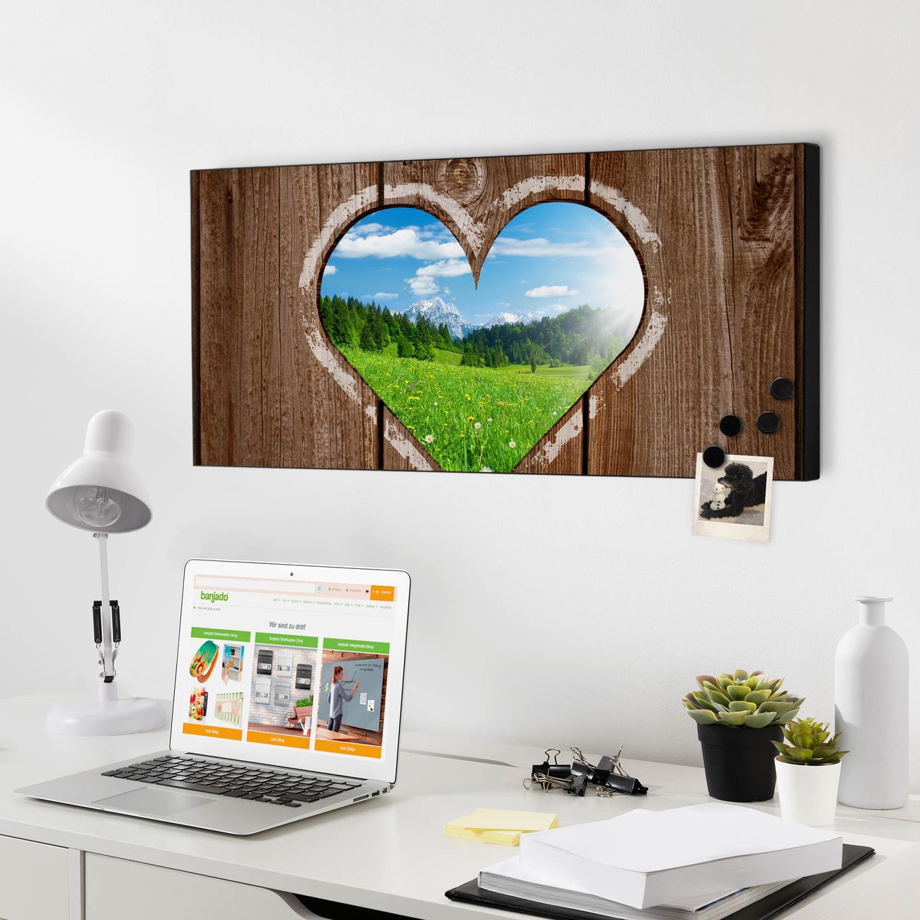 Motiv Ausblick mit Herz Nr. 10113 Größe: 78x37x2cm BxHxT Gewicht: ca. 2,10 kg Material: Stahlblech schwarz, Premiumfolie mit Schutzlaminat Magnete: für Dekomagnete geeignet beschreibbar: Nein Format: Querformat Zubehör: 4 Magnete, Schrauben und Dübel