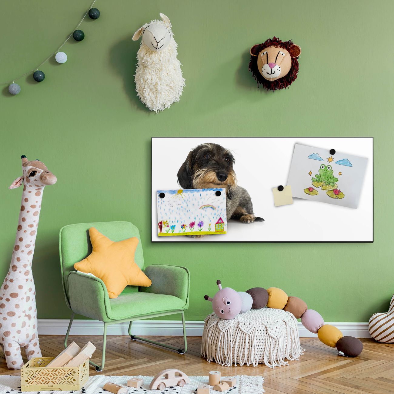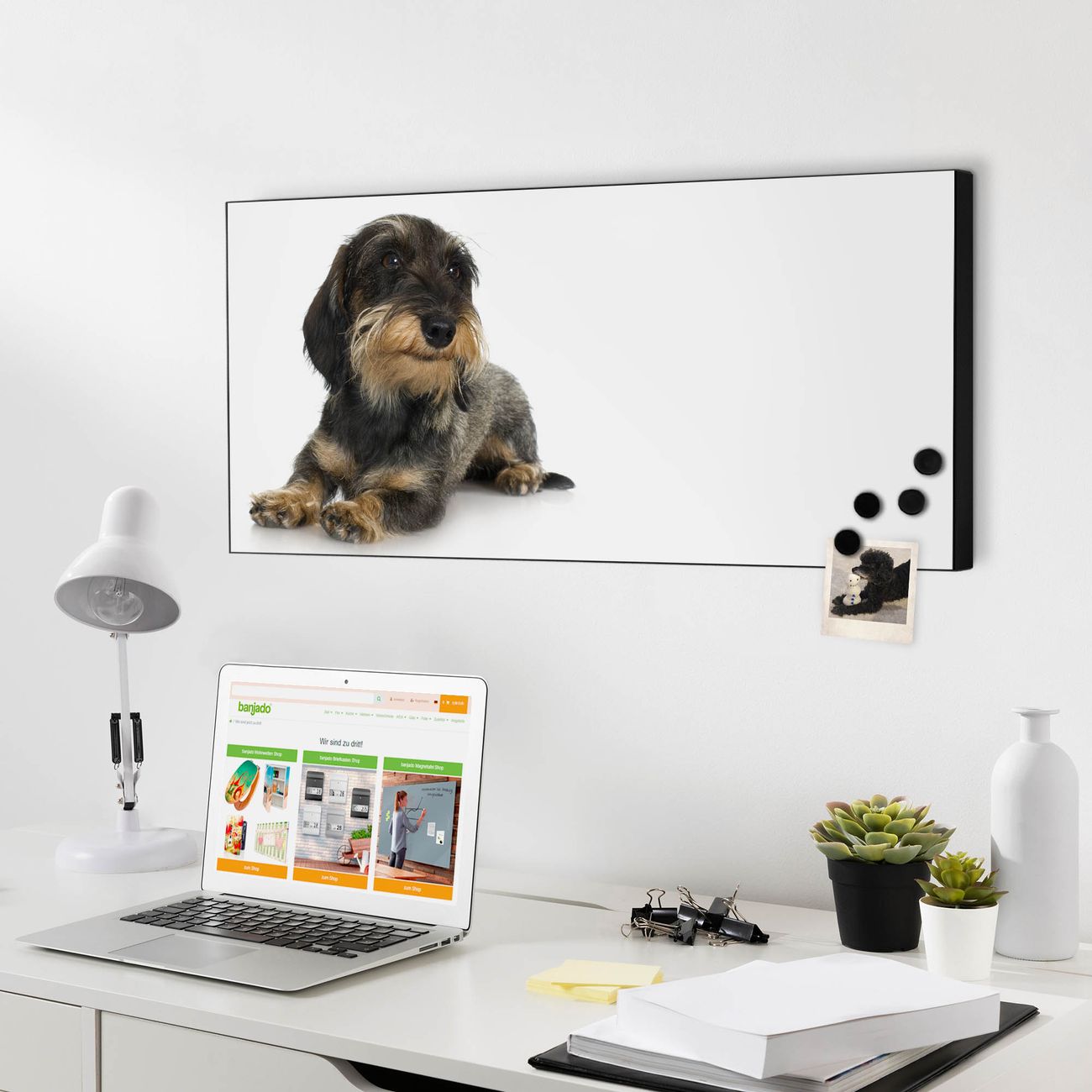 FUNKTION:  Die banjado Magnettafel mit Dackel Motiv bringt Ordnung in Ihr Zettelchaos. Fotos, Termine, Notizen oder Rezepte lassen Sich hier stilvoll mit Magneten ordnen, Sie behalten alles im Blick. An der Design Magnetwand halten alle handesüblichen Magnete. DESIGN:  Die Metall Pinnwand mit dem Motiv Dackel ist ein eleganter Begleiter im Alltag. Mit dieser Magnettafel haben Sie auch ohne Notizen und Magnete ein schönes Dekoelement. Das Format bietet Ihnen ausreichend Platz um alle wichtigen Informationen im Blick zu behalten. DETAILS: Die magnetische Pinnwand besteht aus silber-grau, weiß oder schwarz lackiertem Stahl. Sie hat eine Größe von 78cm x 37cm. Es befinden sich auf der Rückseite vorgefertigte Löcher die eine schnelle und unkomplizierte Anbringung ermöglichen. Das Motiv ist mit einem seidenmatten Laminat versehen und schützt so zusätzlich vor Kratzern. NUTZEN:  Sie können diese Magnettafel wunderbar als Wandbild nutzen, es halten alle handelsüblichen Magneten daran. Das Memoboard ist mit einem feuchten Lappen oder Schwamm abwischbar. Sie finden bei uns eine große Auswahl an passenden Magneten. BANJADO:  Wir sind ein kleines Team aus dem Herzen von Sachsen. Wir fertigen alle Artikel von Hand für Sie an, Sie erhalten keine preiswerte Importware. Auf Wunsch können Sie auch Ihr eigenes Foto auf die Magnettafel aufbringen, schreiben Sie uns an. Herzlichst, Ihr banjado-Team