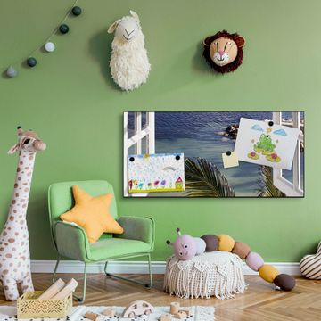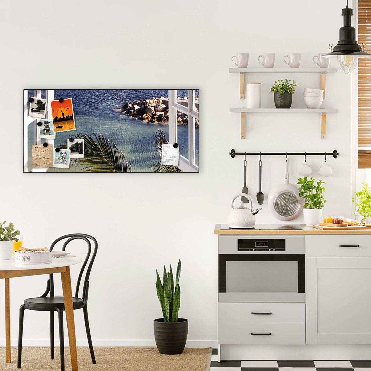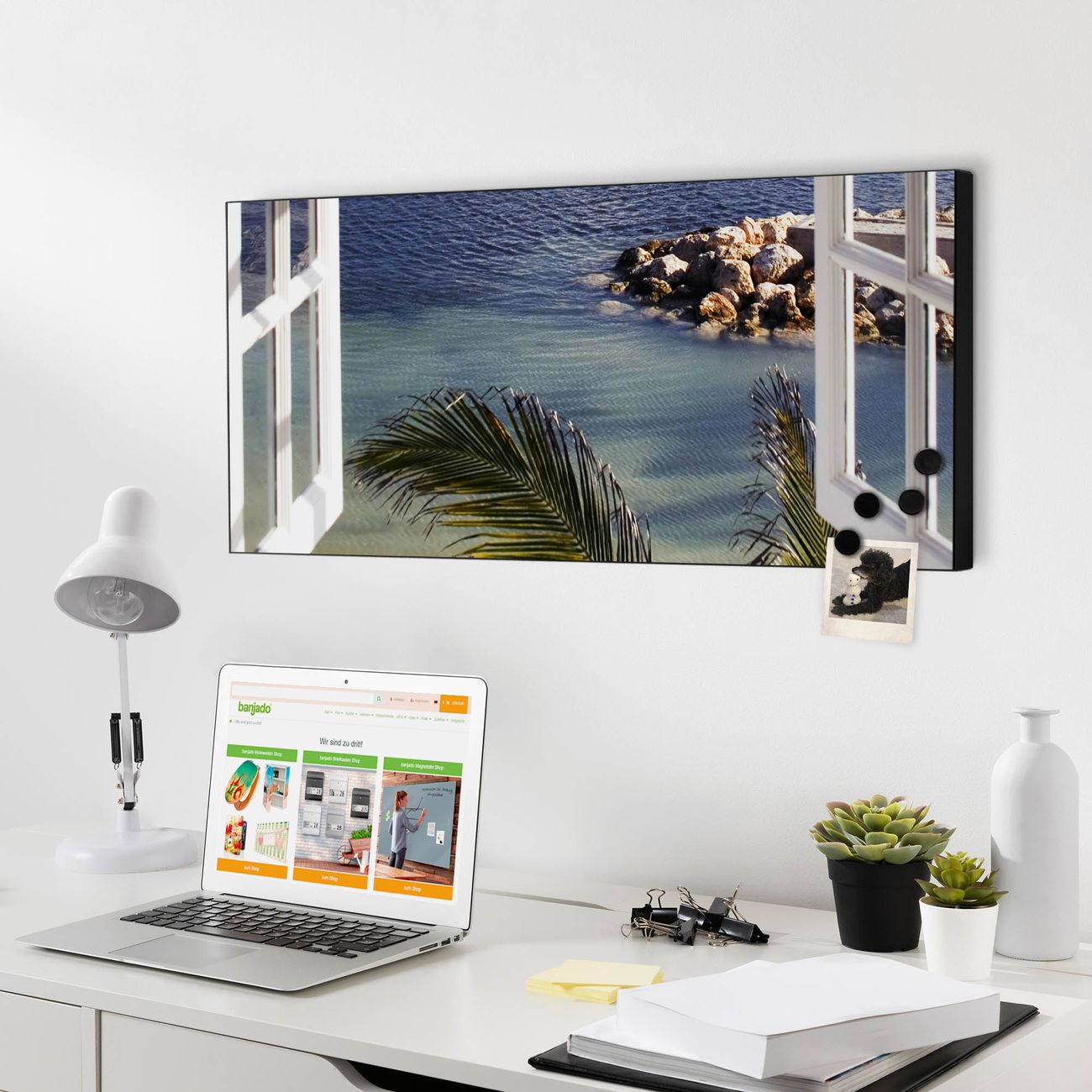 FUNKTION:  Die banjado Magnettafel mit Motiv Fensterpanorama Motiv bringt Ordnung in Ihr Zettelchaos. Fotos, Termine, Notizen oder Rezepte lassen Sich hier stilvoll mit Magneten ordnen, Sie behalten alles im Blick. An der Design Magnetwand halten alle handesüblichen Magnete. DESIGN:  Die Metall Pinnwand mit dem Motiv Motiv Fensterpanorama ist ein eleganter Begleiter im Alltag. Mit dieser Magnettafel haben Sie auch ohne Notizen und Magnete ein schönes Dekoelement. Das Format bietet Ihnen ausreichend Platz um alle wichtigen Informationen im Blick zu behalten. DETAILS: Die magnetische Pinnwand besteht aus silber-grau, weiß oder schwarz lackiertem Stahl. Sie hat eine Größe von 78cm x 37cm. Es befinden sich auf der Rückseite vorgefertigte Löcher die eine schnelle und unkomplizierte Anbringung ermöglichen. Das Motiv ist mit einem seidenmatten Laminat versehen und schützt so zusätzlich vor Kratzern. NUTZEN:  Sie können diese Magnettafel wunderbar als Wandbild nutzen, es halten alle handelsüblichen Magneten daran. Das Memoboard ist mit einem feuchten Lappen oder Schwamm abwischbar. Sie finden bei uns eine große Auswahl an passenden Magneten. BANJADO:  Wir sind ein kleines Team aus dem Herzen von Sachsen. Wir fertigen alle Artikel von Hand für Sie an, Sie erhalten keine preiswerte Importware. Auf Wunsch können Sie auch Ihr eigenes Foto auf die Magnettafel aufbringen, schreiben Sie uns an. Herzlichst, Ihr banjado-Team