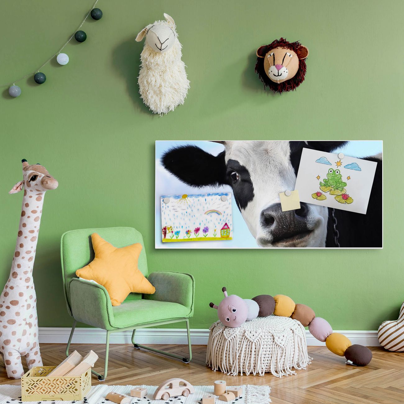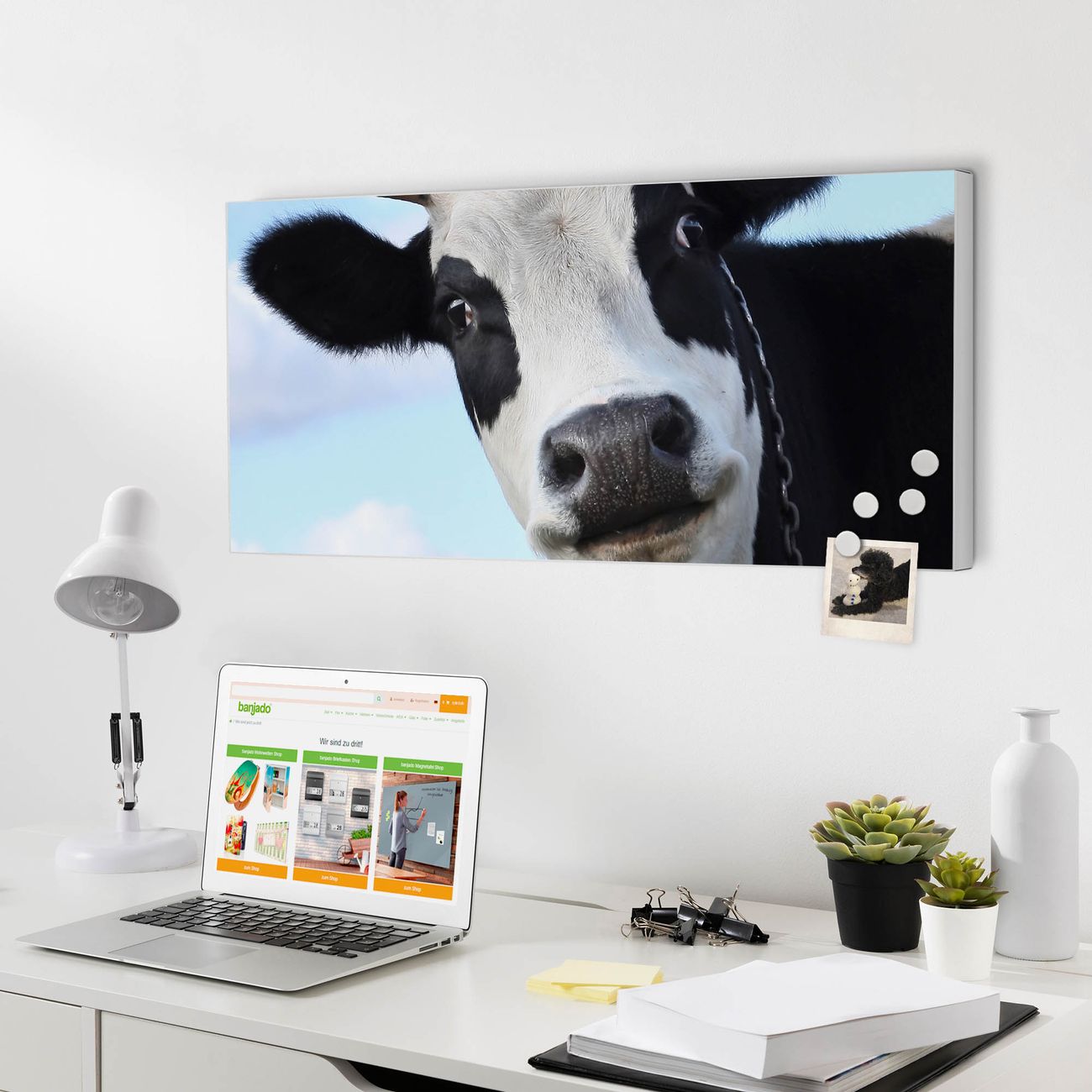 FUNKTION:  Die banjado Magnettafel mit Motiv Muh Motiv bringt Ordnung in Ihr Zettelchaos. Fotos, Termine, Notizen oder Rezepte lassen Sich hier stilvoll mit Magneten ordnen, Sie behalten alles im Blick. An der Design Magnetwand halten alle handesüblichen Magnete. DESIGN:  Die Metall Pinnwand mit dem Motiv Motiv Muh ist ein eleganter Begleiter im Alltag. Mit dieser Magnettafel haben Sie auch ohne Notizen und Magnete ein schönes Dekoelement. Das Format bietet Ihnen ausreichend Platz um alle wichtigen Informationen im Blick zu behalten. DETAILS: Die magnetische Pinnwand besteht aus silber-grau, weiß oder schwarz lackiertem Stahl. Sie hat eine Größe von 78cm x 37cm. Es befinden sich auf der Rückseite vorgefertigte Löcher die eine schnelle und unkomplizierte Anbringung ermöglichen. Das Motiv ist mit einem seidenmatten Laminat versehen und schützt so zusätzlich vor Kratzern. NUTZEN:  Sie können diese Magnettafel wunderbar als Wandbild nutzen, es halten alle handelsüblichen Magneten daran. Das Memoboard ist mit einem feuchten Lappen oder Schwamm abwischbar. Sie finden bei uns eine große Auswahl an passenden Magneten. BANJADO:  Wir sind ein kleines Team aus dem Herzen von Sachsen. Wir fertigen alle Artikel von Hand für Sie an, Sie erhalten keine preiswerte Importware. Auf Wunsch können Sie auch Ihr eigenes Foto auf die Magnettafel aufbringen, schreiben Sie uns an. Herzlichst, Ihr banjado-Team